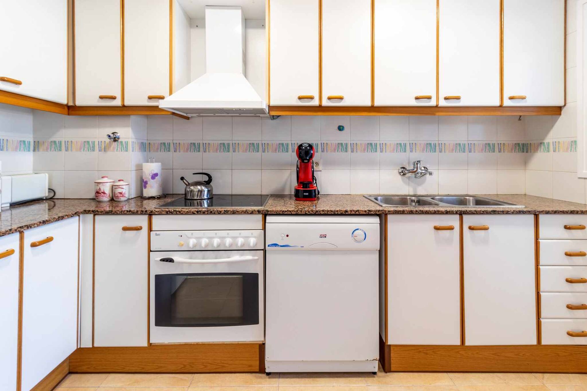 Kitchen equipped with vitroceramic hob, highchair, dishwasher, fridge, freezer, microwave, Nespresso coffee machine and Melitta coffee maker, kettle, tableware, oven.