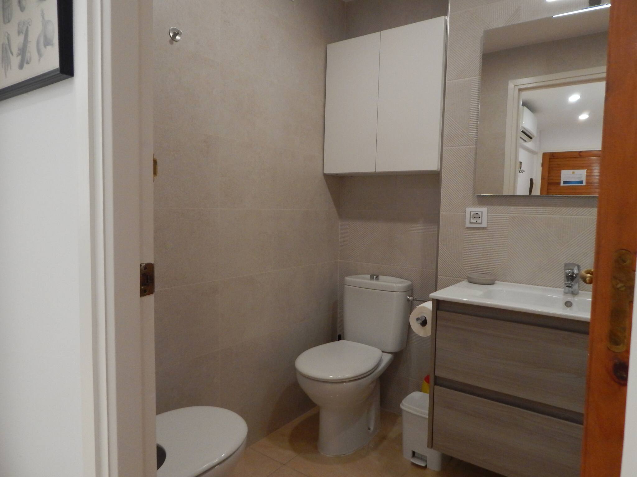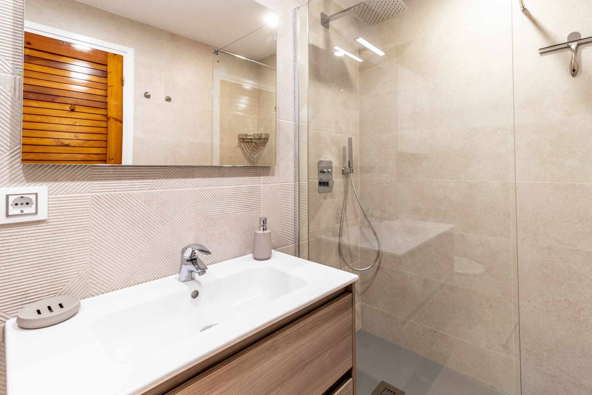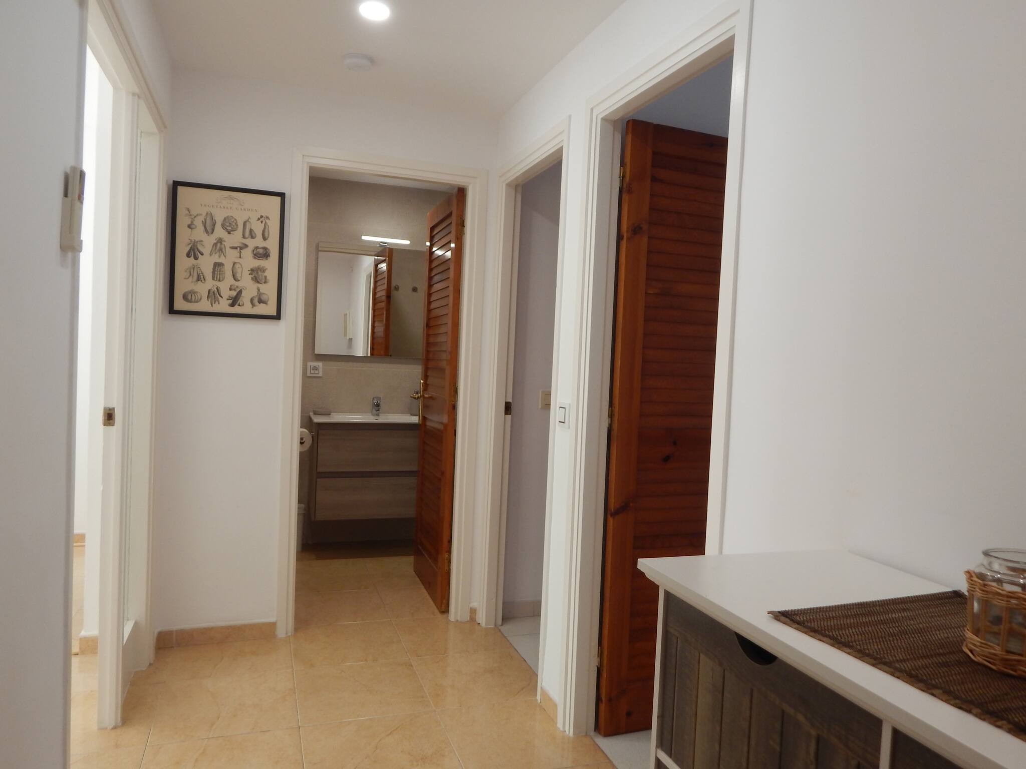 The apartment has two double bedrooms, one with a double bed and the other one with two single beds. Full bathroom with shower. Equipped kitchen and bright, spacious lounge-dining room with sofa-bed for two people, armchairs, TV, dining table and chairs and access to the outside terrace.