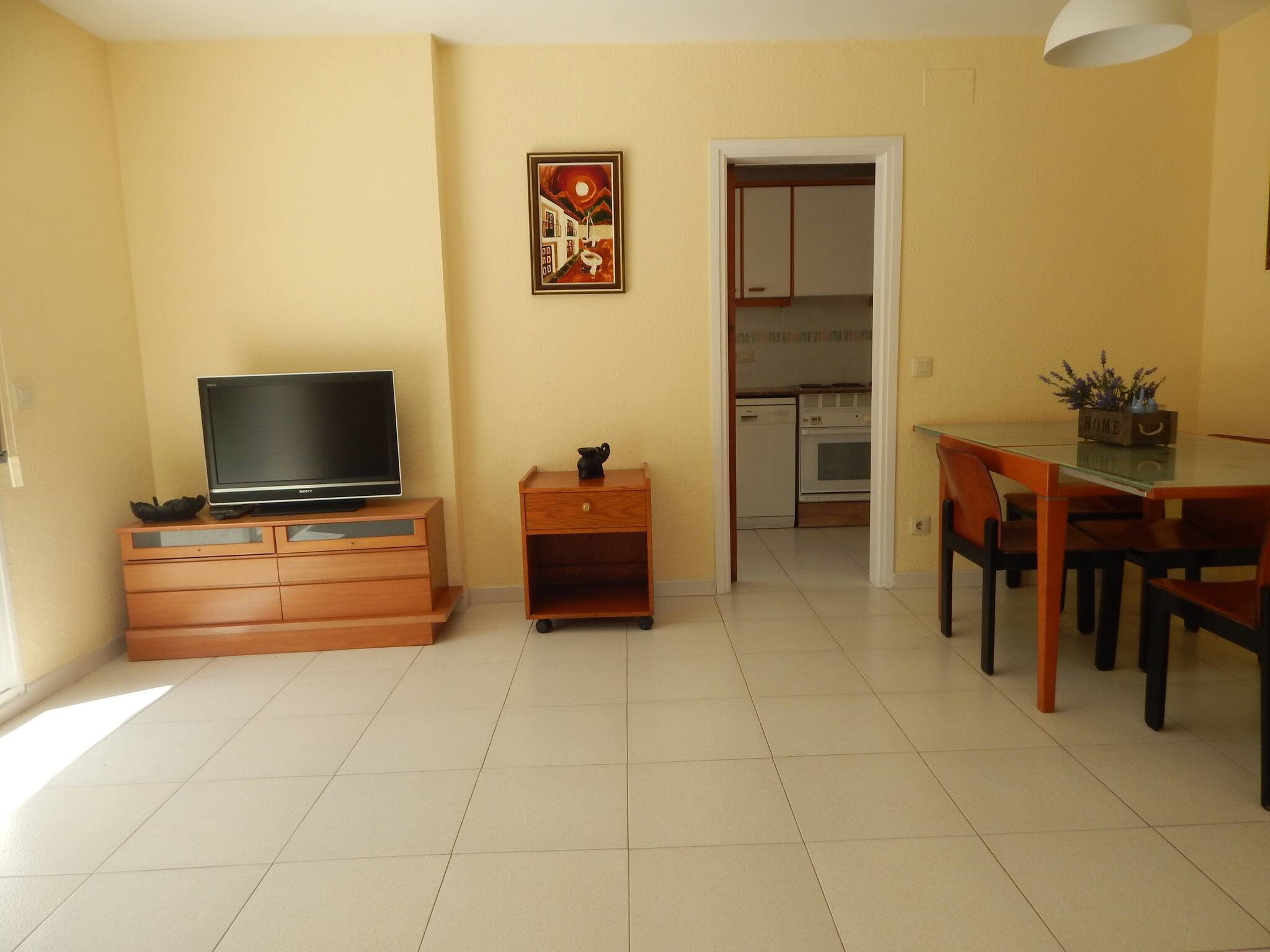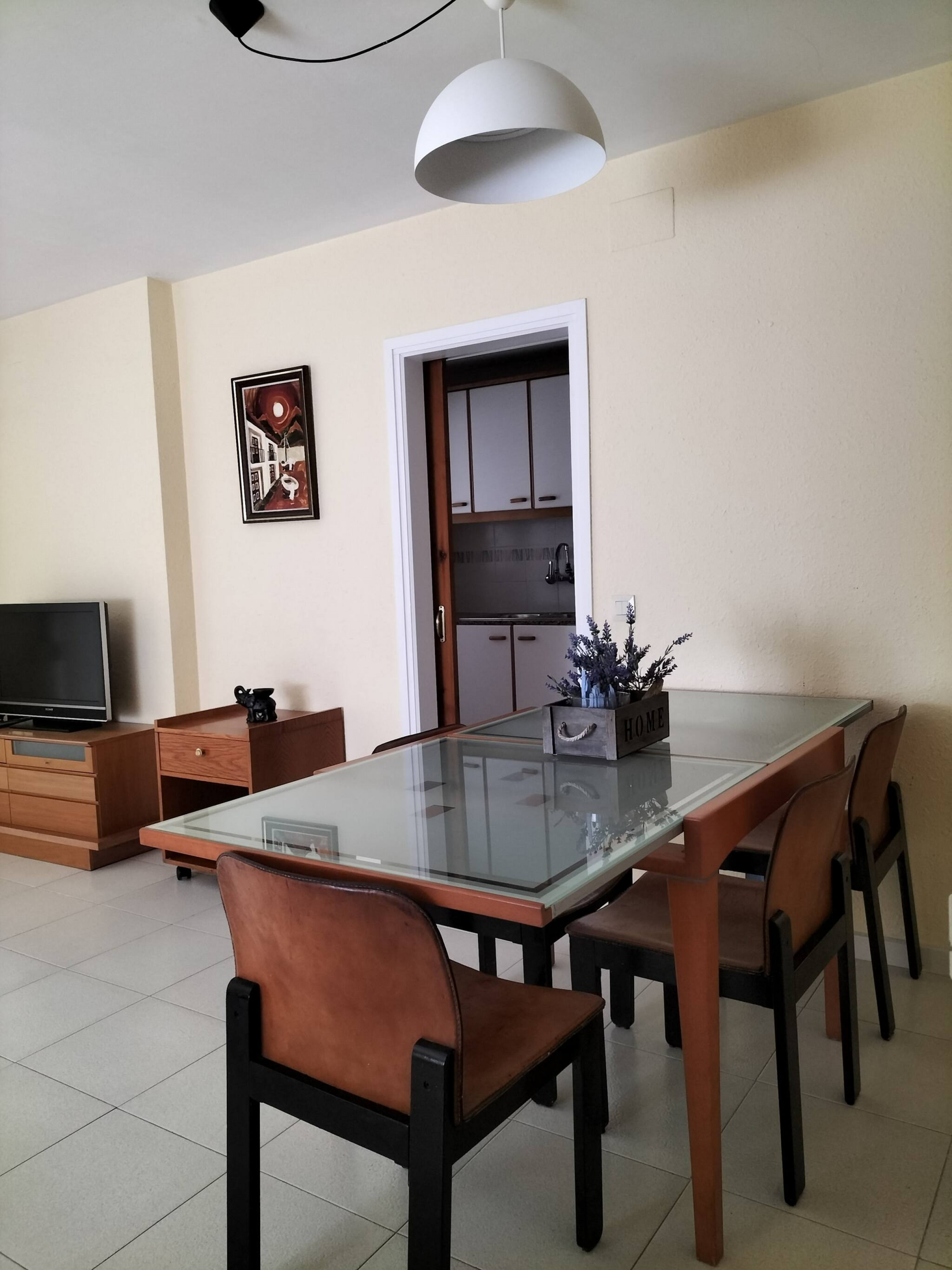 The apartment has two double bedrooms, one with a double bed and the other one with two single beds. Full bathroom with shower. Equipped kitchen and bright, spacious lounge-dining room with sofa-bed for two people, armchairs, TV, dining table and chairs and access to the outside terrace.