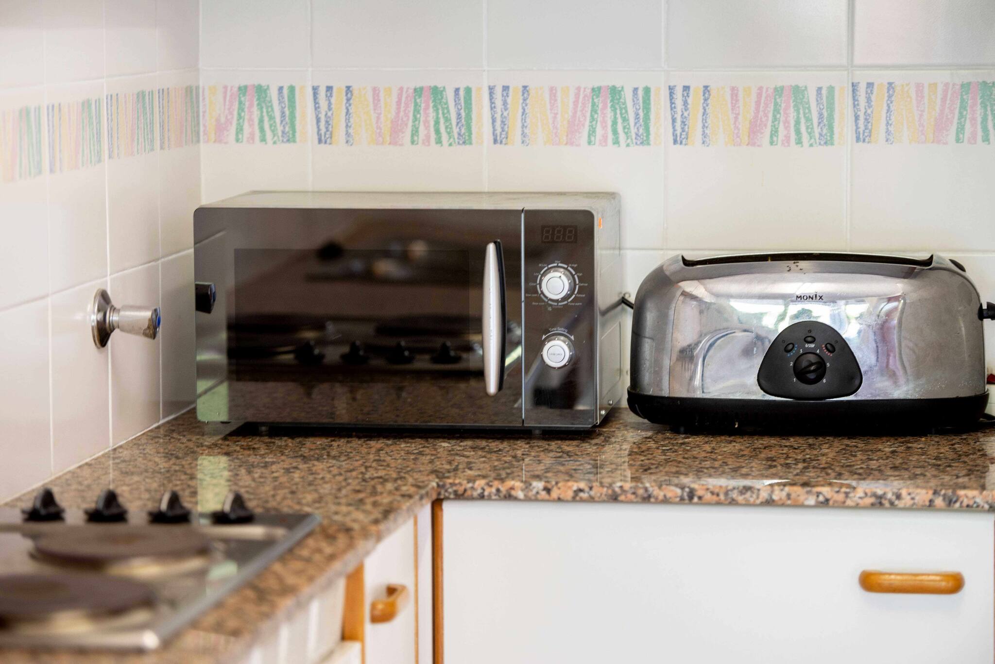Kitchen equipped with vitroceramic hob, highchair, dishwasher, fridge, freezer, microwave, Nespresso coffee machine and Melitta coffee maker, kettle, tableware, oven.