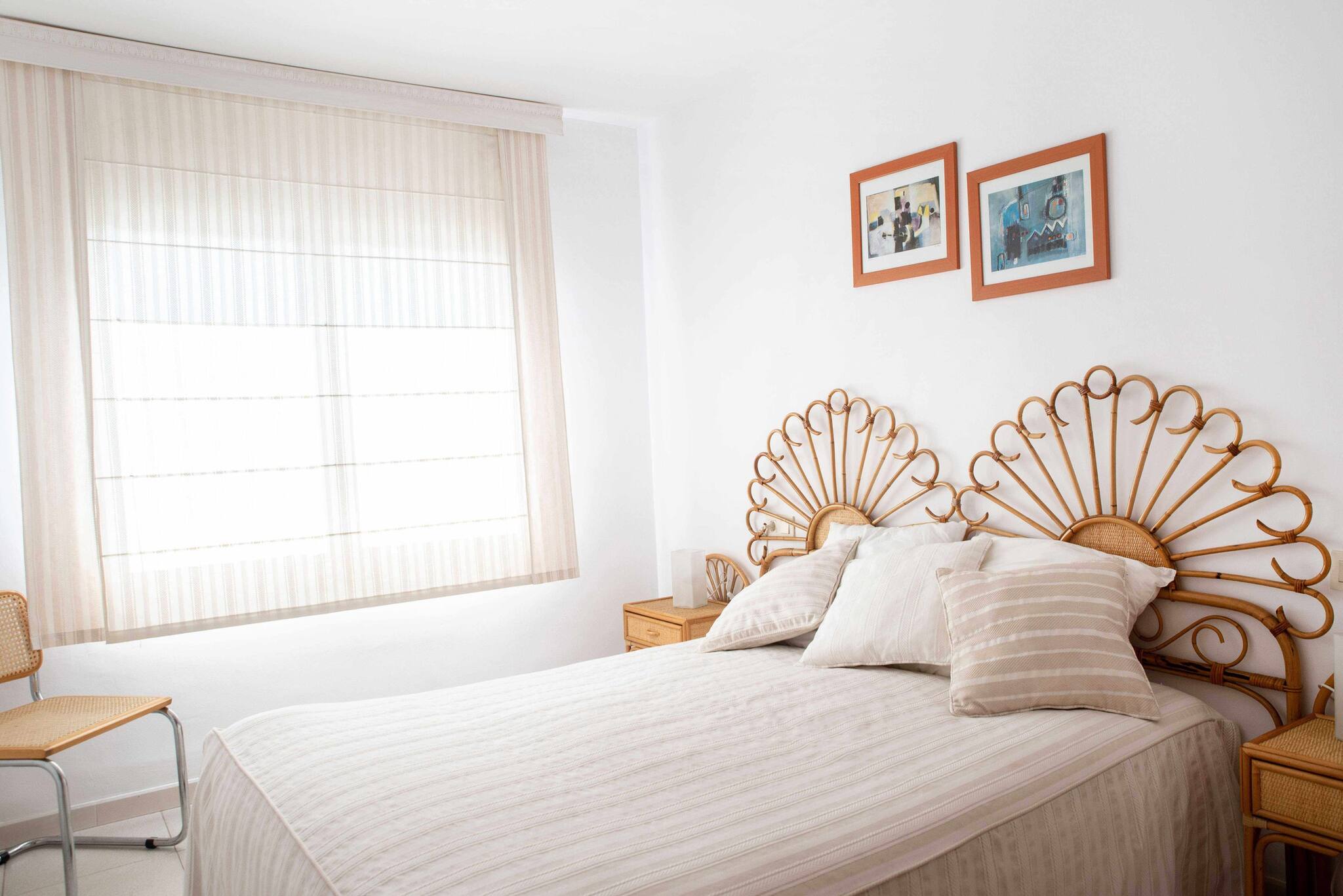 Bedrooms: two double bedrooms, one with a double bed and the other one with two single beds. Bedside tables, wardrobe, drawers, reading lamp and hangers. Bed linen.