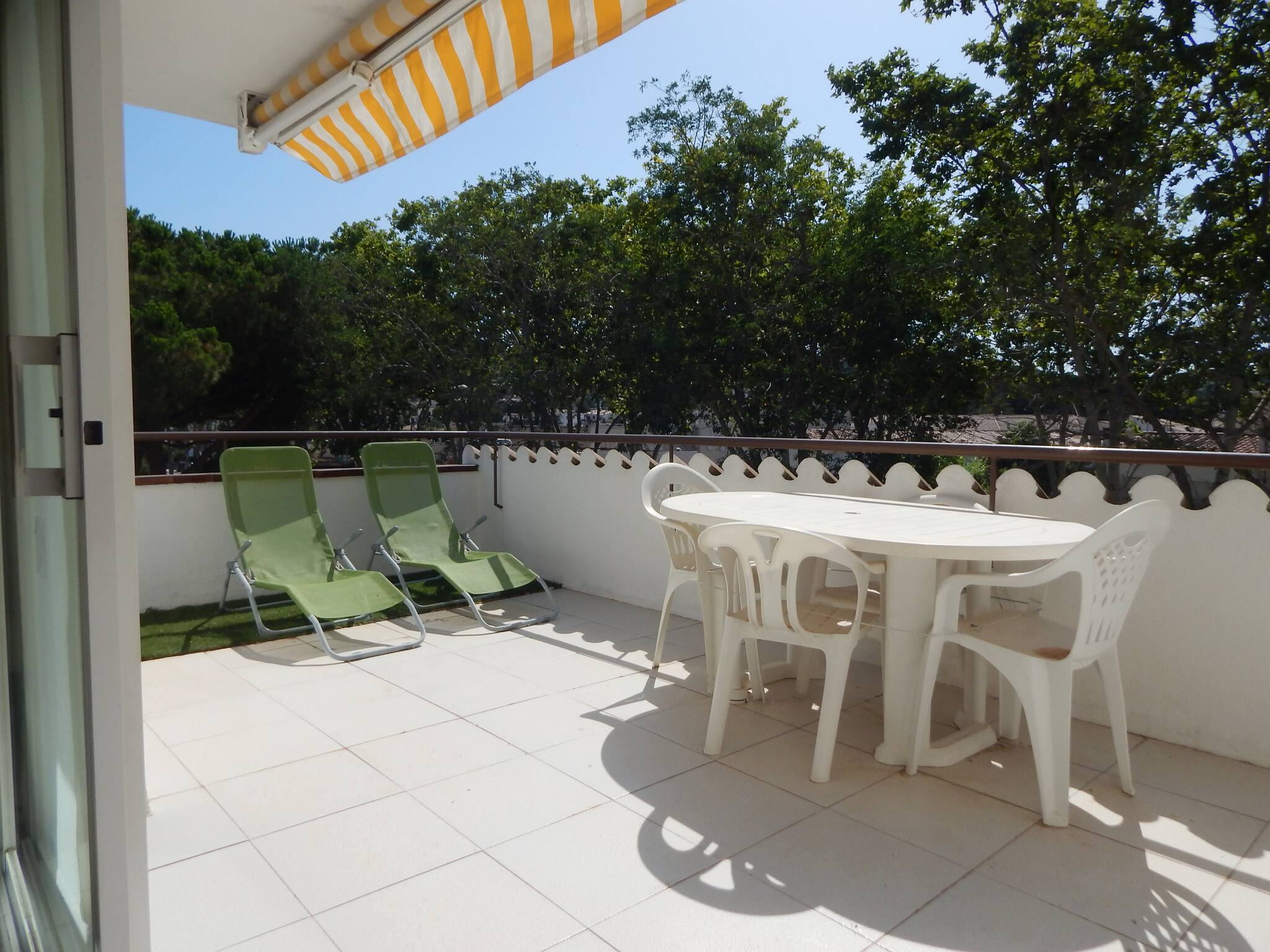 Outside: terrace with table, chairs, sun loungers, washing machine, awning. Communal garden and pool.