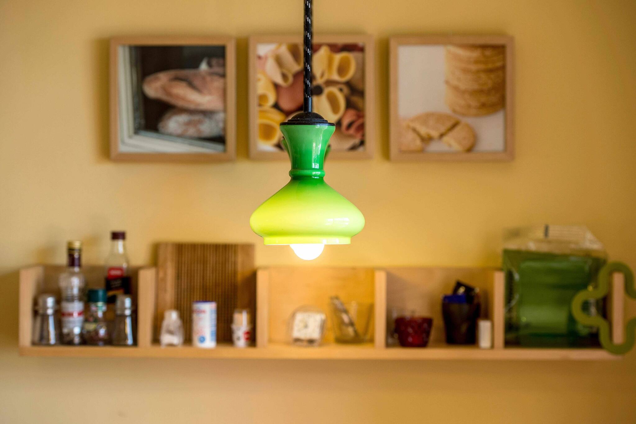 Kitchen equipped with vitroceramic hob, fridge, freezer, microwave, Italian Moka coffee pot, toaster, worktop, tableware, oven.