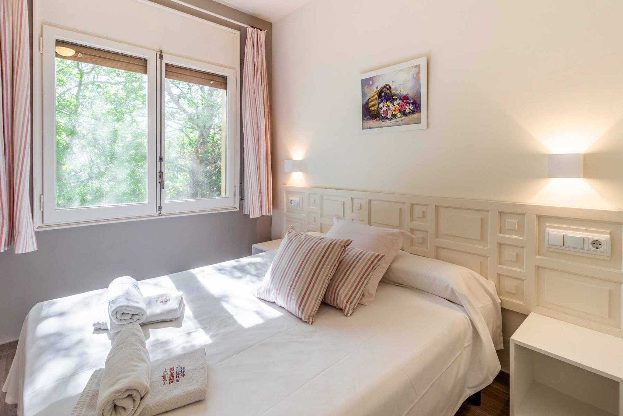 Bedrooms: one bedroom with a double bed, bedside tables, reading lamps, built-in wardrobe. 1 sofa-bed for two people in the lounge-dining room. Bed linen.