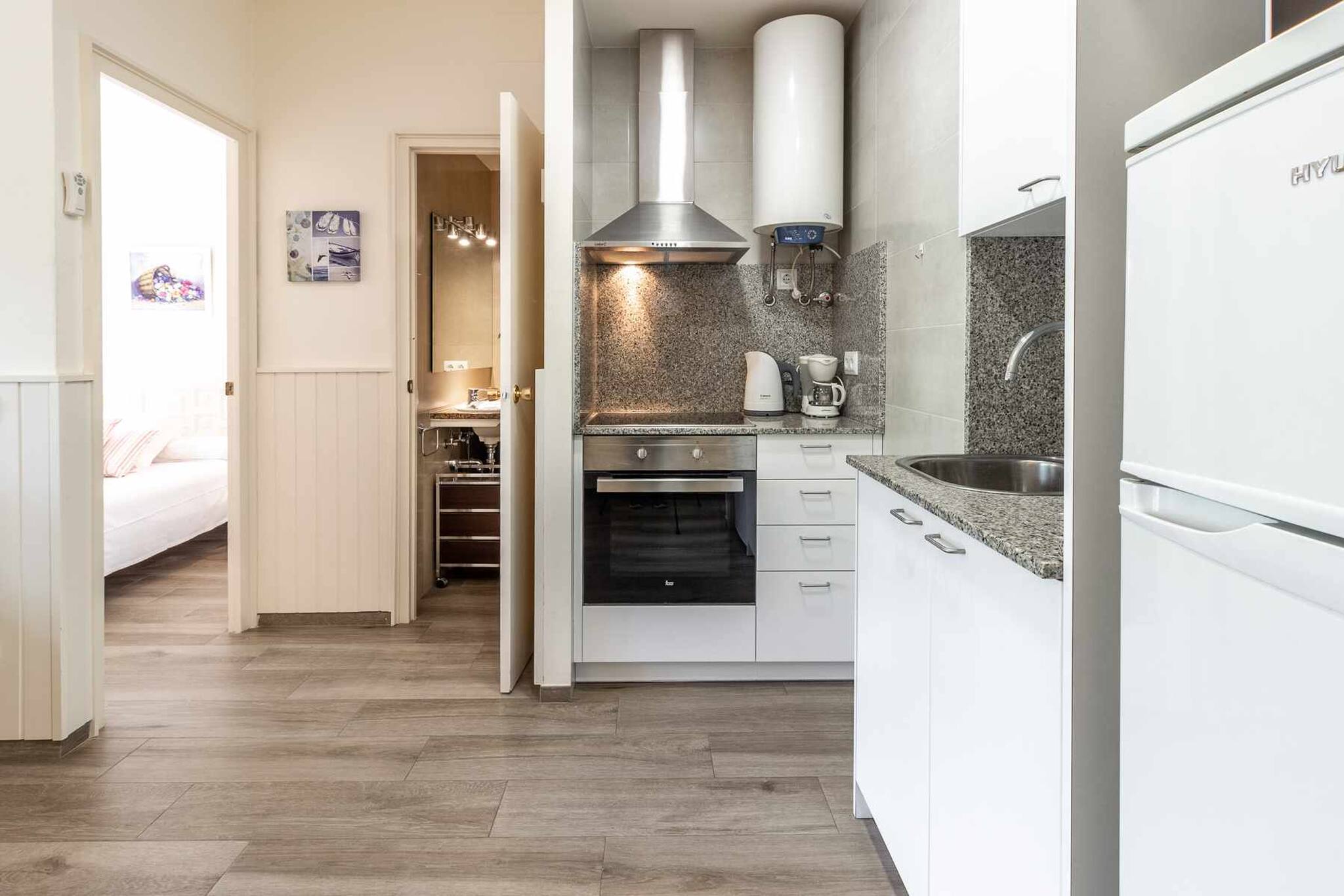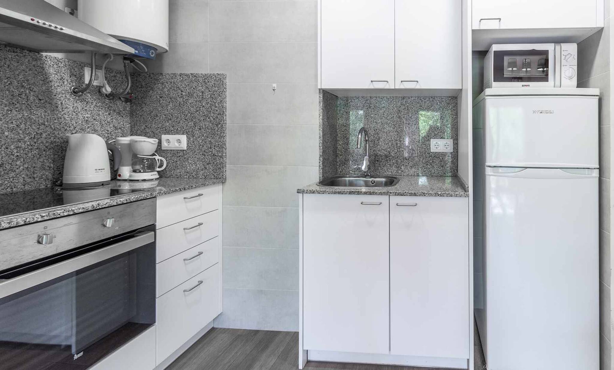 The apartment has one bedroom with a double bed and built-in wardrobe. Full bathroom with walk-in shower. Small but well-equipped kitchen next to the dining room, and a lounge-dining room with a sofa-bed for two people, wooden table and chairs and a door leading to a small terrace with outdoor furniture.