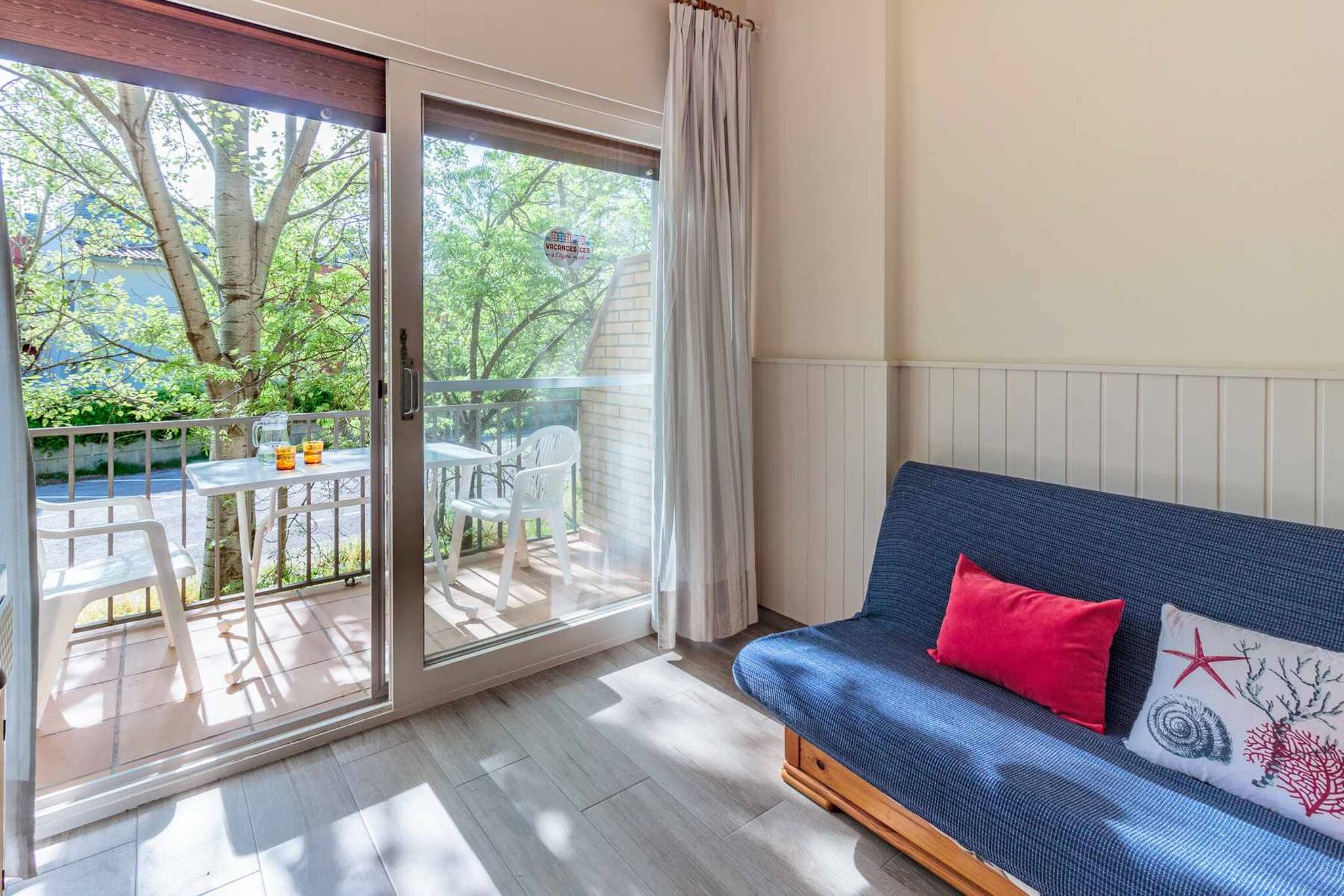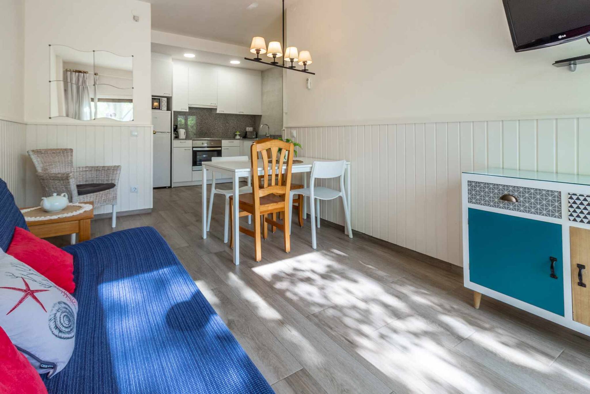 The apartment has one bedroom with a double bed and built-in wardrobe. Full bathroom with walk-in shower. Small but well-equipped kitchen next to the dining room, and a lounge-dining room with a sofa-bed for two people, wooden table and chairs and a door leading to a small terrace with outdoor furniture.