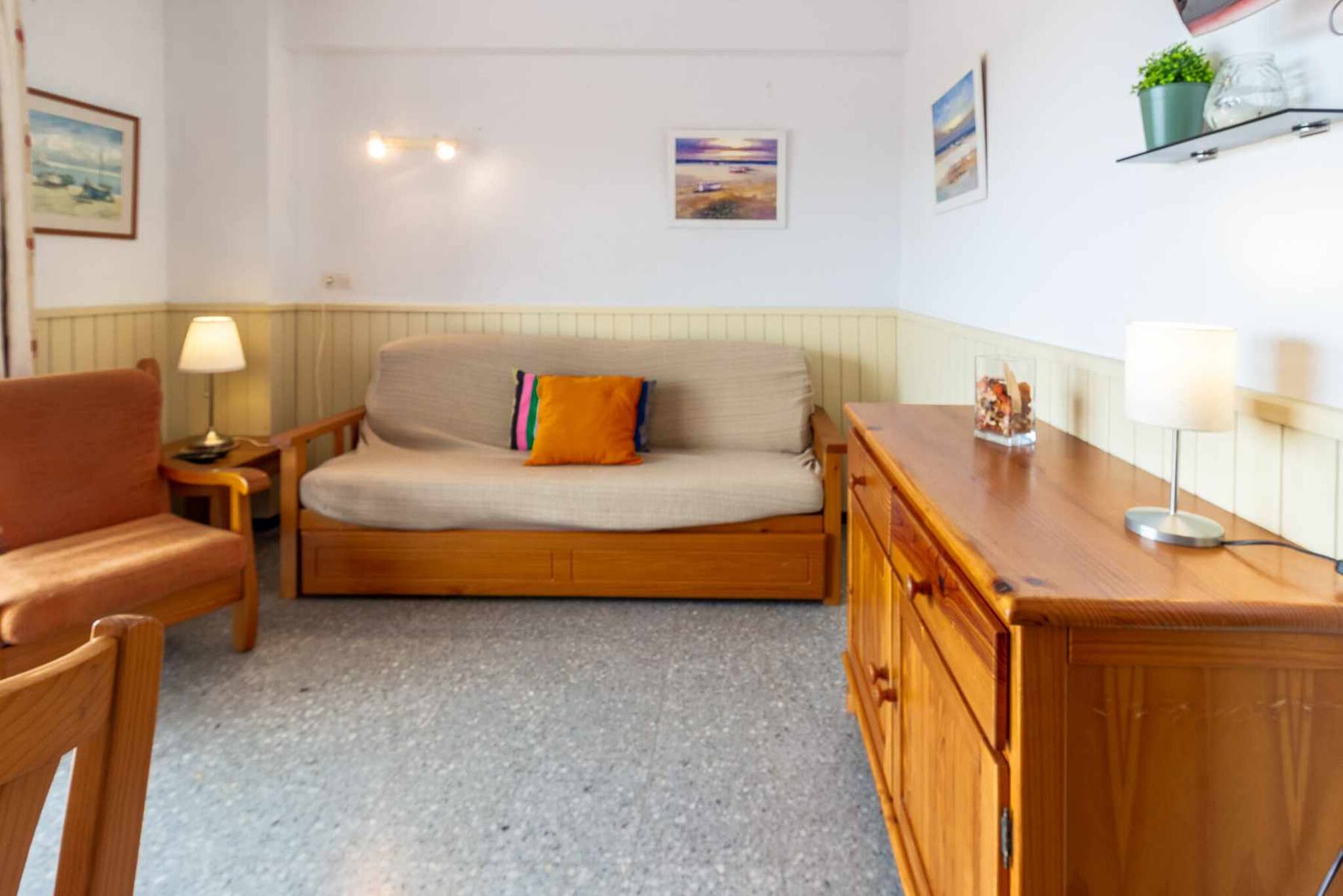 It has one bedroom with a double bed and a sofa-bed for two people in the lounge-dining room. Full bathroom with bath. Small equipped kitchen. Spacious lounge-dining room with door leading to the outdoor terrace, with table and chairs.