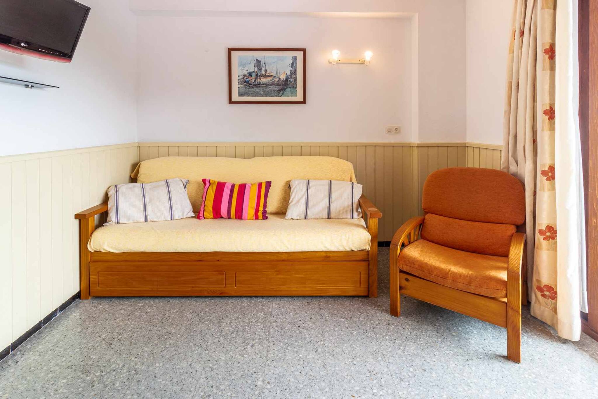 It has one bedroom with a double bed and a sofa-bed for two people in the lounge-dining room. Full bathroom with bath. Small equipped kitchen. Spacious lounge-dining room with door leading to the outdoor terrace, with table and chairs.