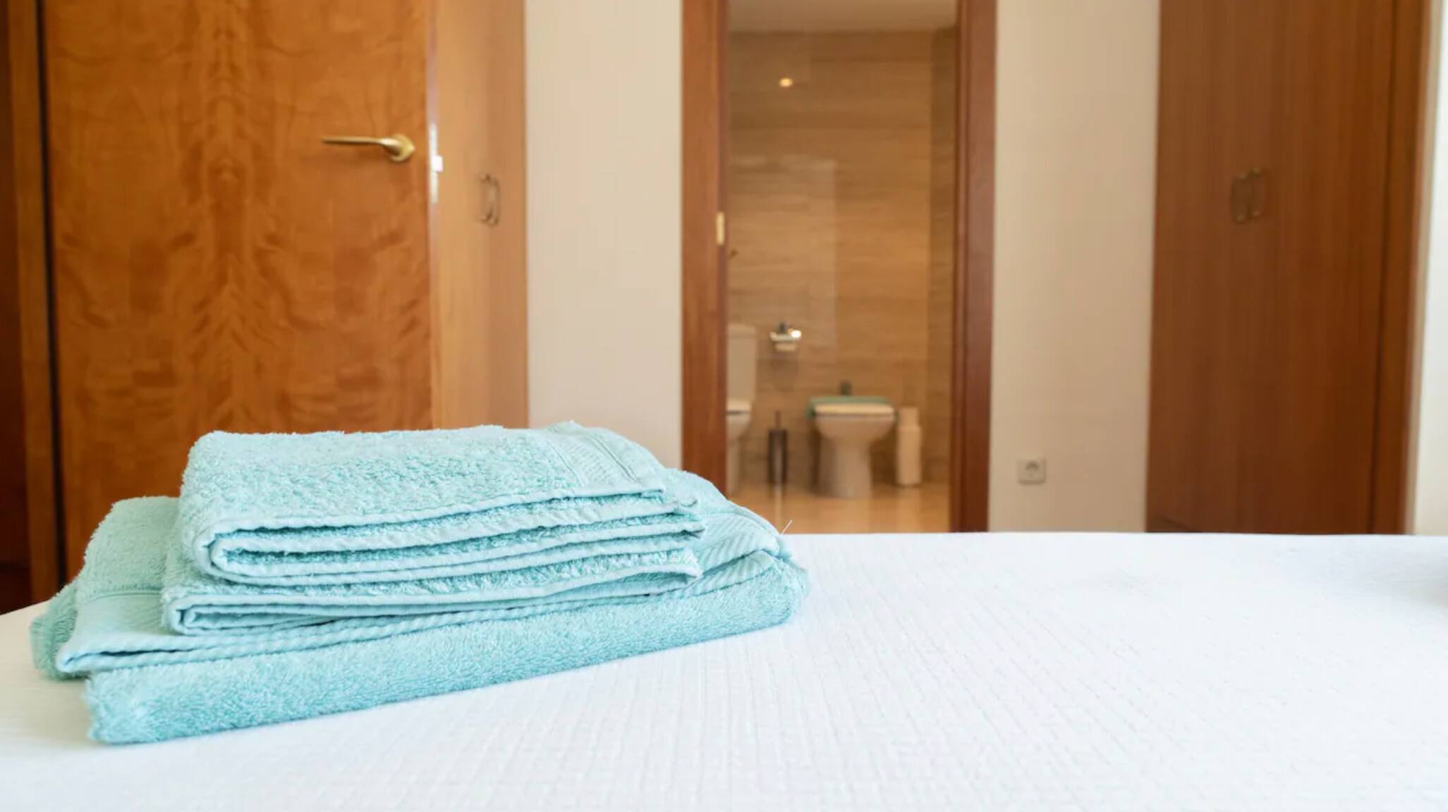 The house has three bedrooms on the upper floor, separating the sleeping area from the lower floor. One of the bedrooms is a suite with an ensuite bathroom and a double bed, and there are two additional bedrooms with single beds. All of them have large closets, allowing for comfortable days out.