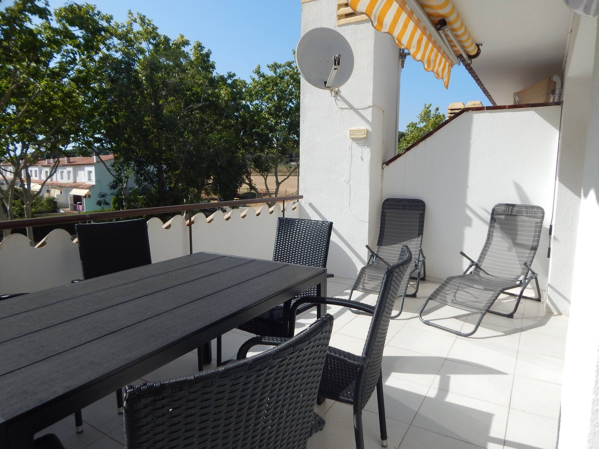 Exterior: terraza con mesa, sillas, tumbonas, lavadora, toldo. Jardín y piscina comunitaria.