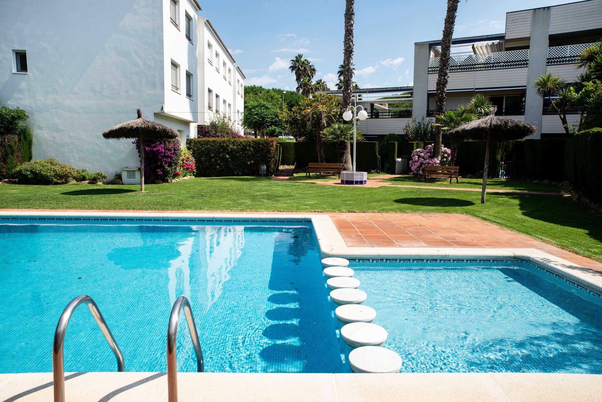 Zona exterior con terraza amueblada, tendedero para la ropa. Jardín y piscina comunitaria.