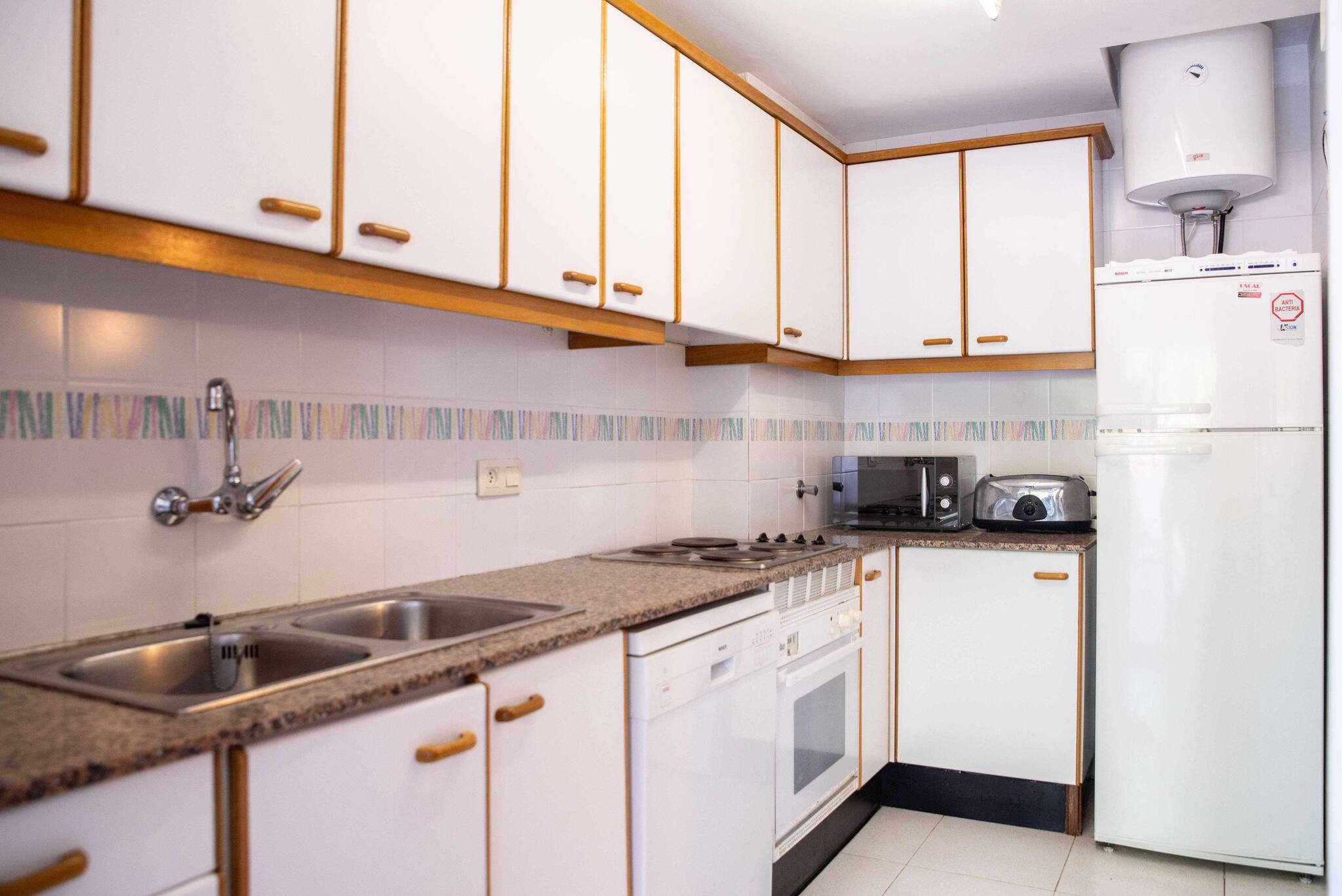 Dispone de dos habitaciones dobles, una con cama de matrimonio y otra con dos camas individuales. Baño completo con ducha. Cocina equipada y salón-comedor muy luminoso y espacioso con sofá cama para dos personas, TV, mesa de comedor con sillas, y salida a la terraza exterior.