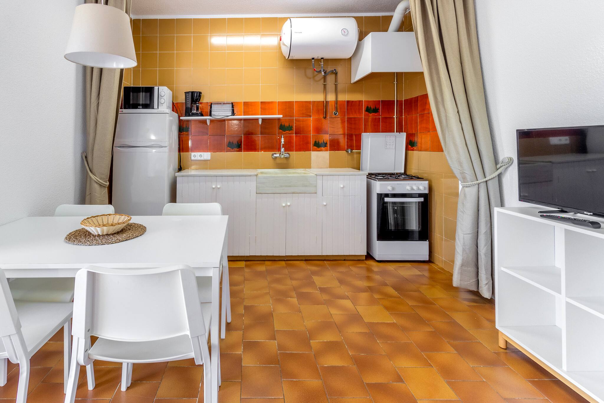 Cocina americana equipada con nevera, congelador, encimera, horno, hervidor de agua, cafetera Melitta, tostadora, vajilla.
