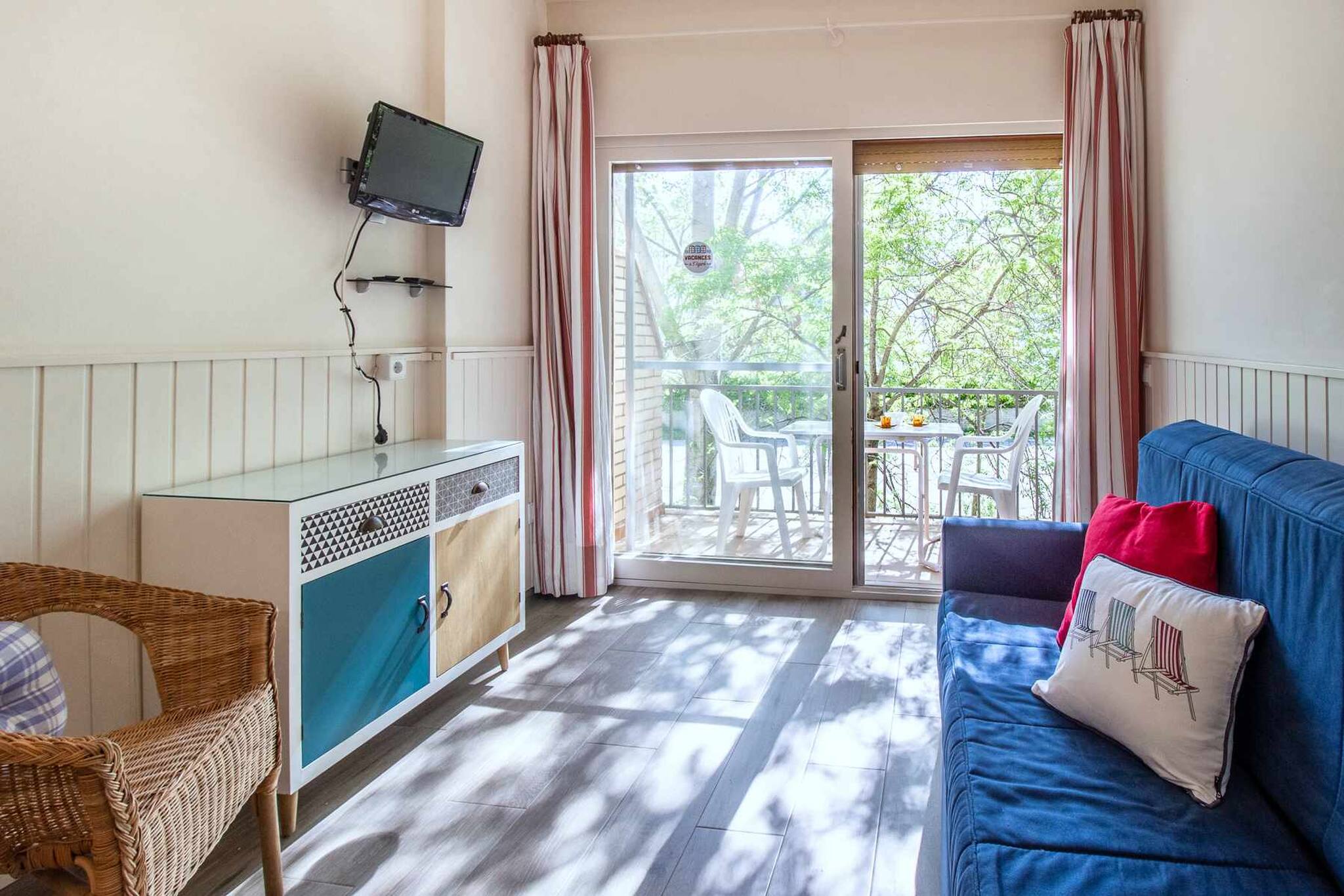 Dispone de una habitación con cama de matrimonio con armarios empotrados. Baño completo con plato de ducha. Cocina pequeña pero bien equipada junto al comedor, y salón-comedor con un sofá cama doble, mesa y sillas de madera y salida a la pequeña terraza con mobiliario de exterior.