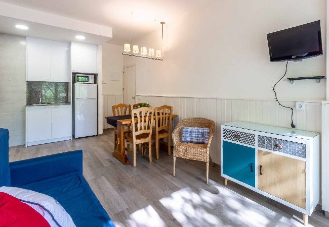 Dispone de una habitación con cama de matrimonio con armarios empotrados. Baño completo con plato de ducha. Cocina pequeña pero bien equipada junto al comedor, y salón-comedor con un sofá cama individual, mesa y sillas de madera y salida a la pequeña terraza con mobiliario de exterior.
