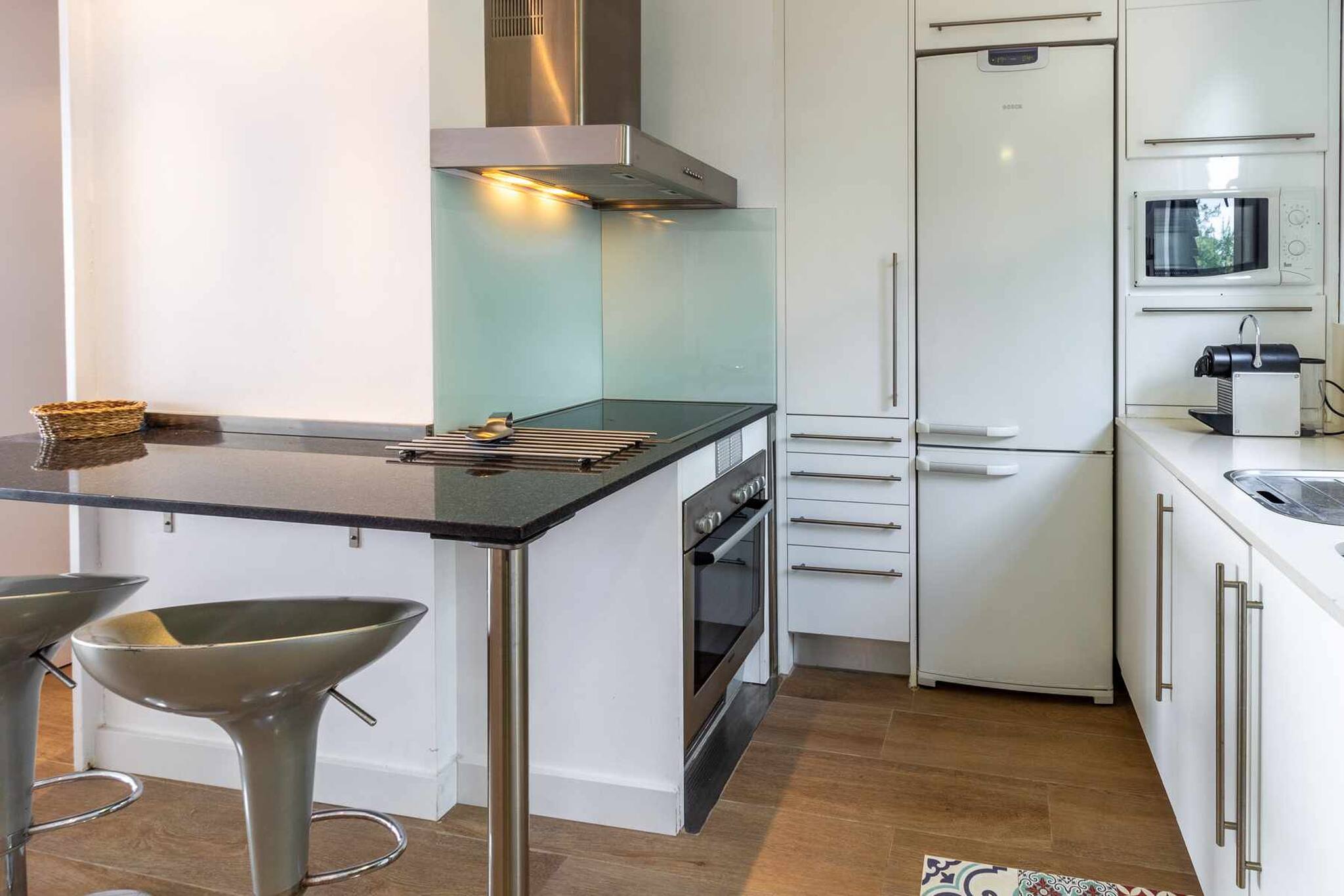 Cocina equipada con vitrocerámica, nevera, congelador, microondas, cafetera Nespresso, tetera, hervidor de agua, lavavajillas, tostadora, encimera, vajilla, horno.
