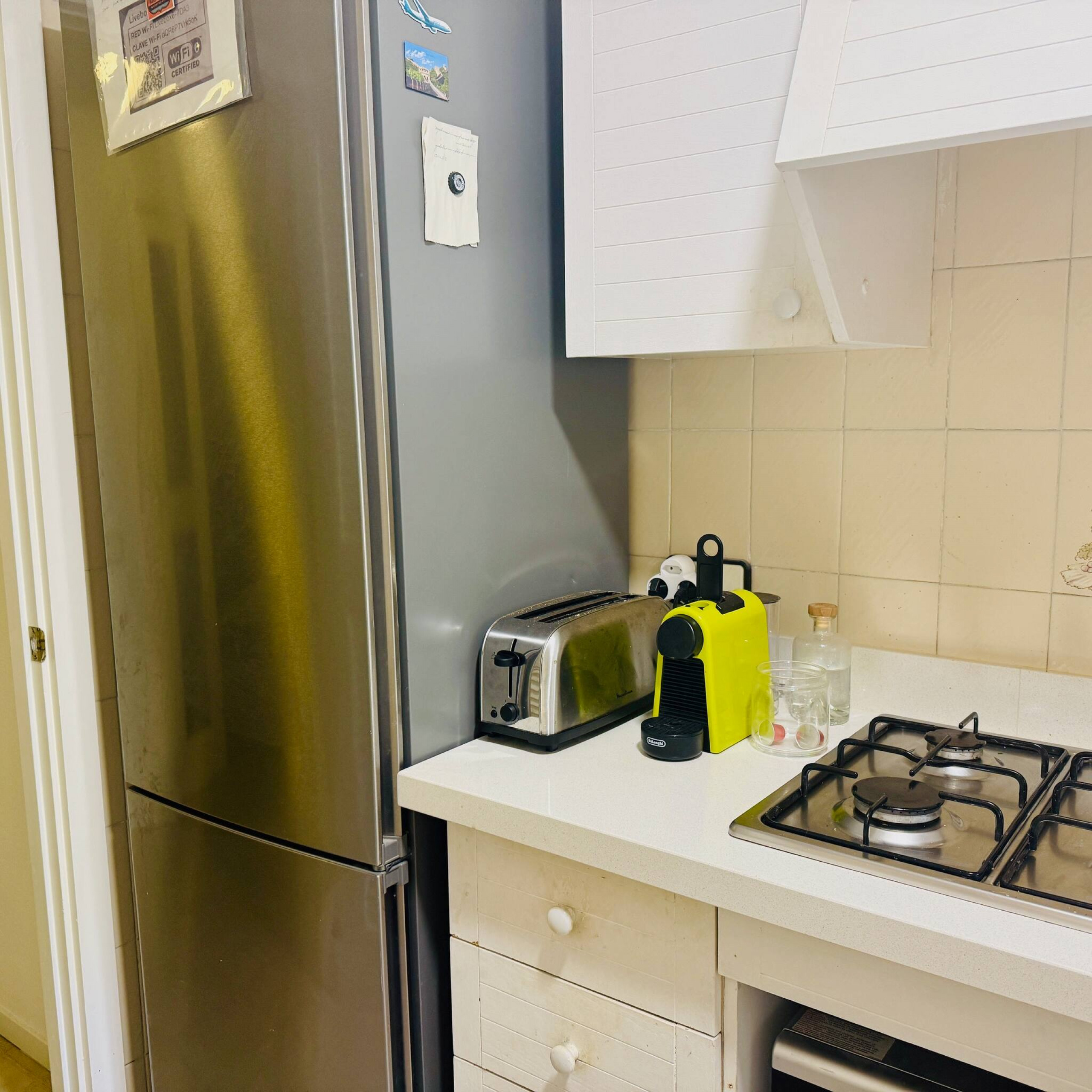 Cocina equipada con nevera/congelador, microondas, cafetera Melitta, horno, hervidor de agua, tostadora, vajilla.