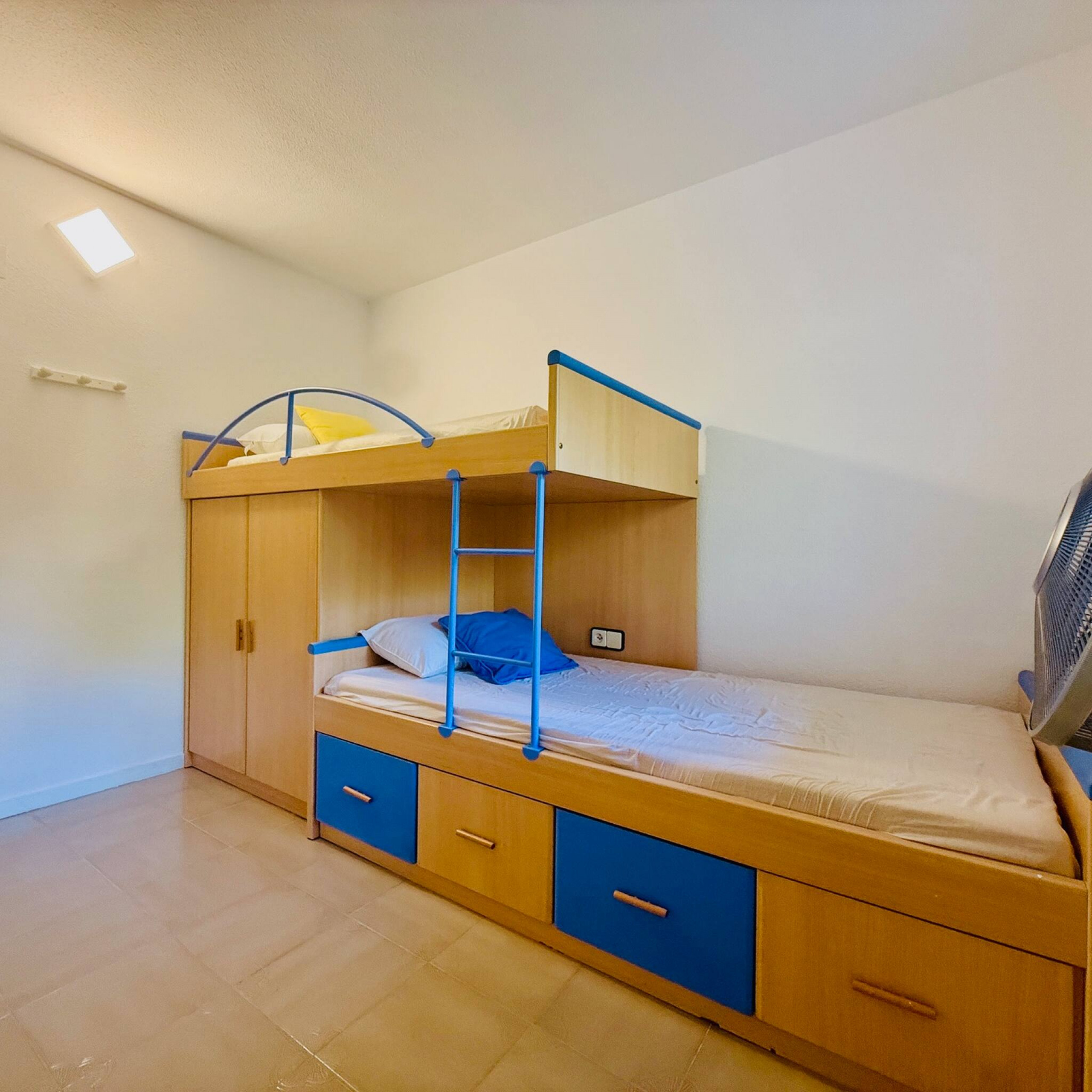 El apartamento dispone de una cocina completamente equipada, que da al salón comedor. Este salón comedor, unido a una terraza y al jardín privado, da una gran sensación de amplitud. Perfectamente amueblado, con wifi, Smart tv y Aire acondicionado y también con muebles de exterior. En paralelo a este salón está el dormitorio tipo suit, también con salida al jardín. Y en el otro lado un dormitorio con 2 camas individuales y un baño completamente reformado que da servicio a este dormitorio.