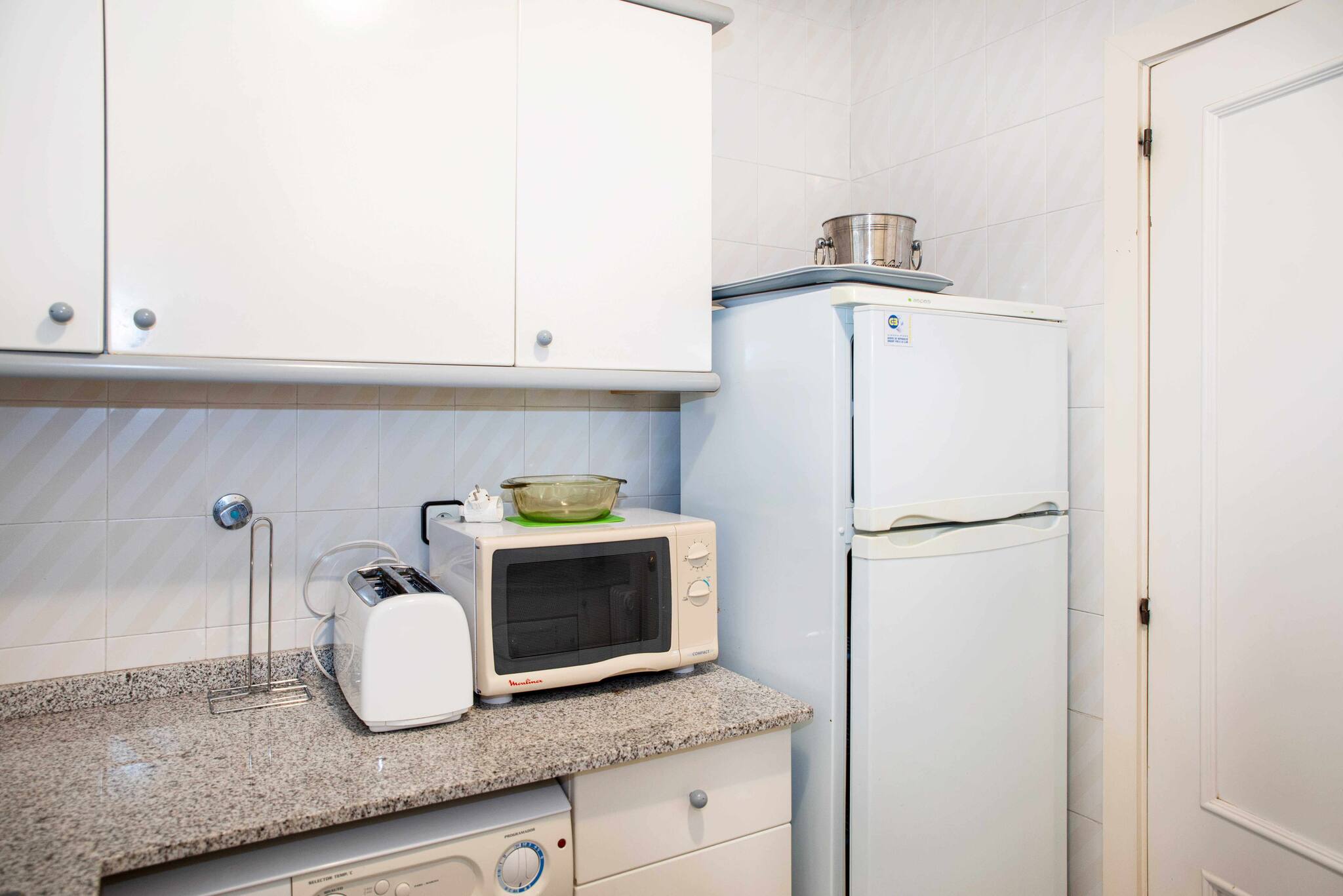 Cocina equipada con nevera, lavavajillas, microondas, vitrocerámica, cafetera Dolce Gusto y melita, tostadora, hervidor de agua, vajilla.
