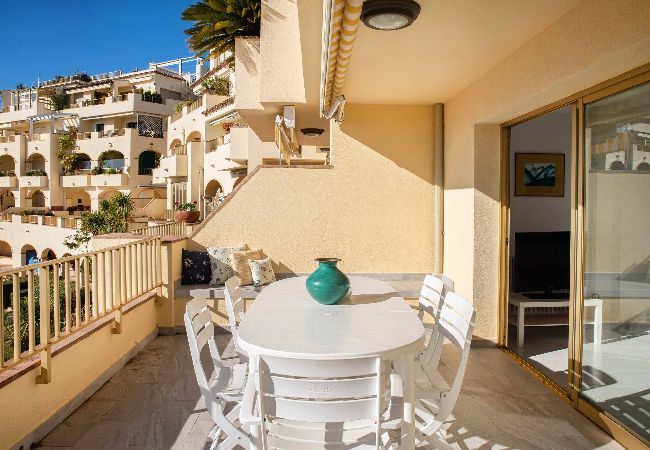 Accedemos a la terraza exterior a través de varias estancias del alojamiento. Tiene mobiliario de exterior y vistas al jardín comunitario y al mar.