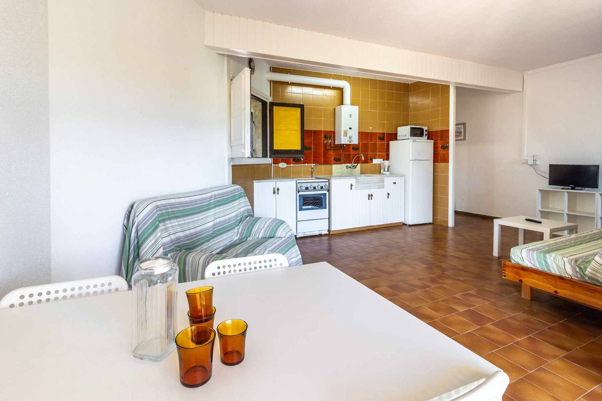 Il dispose d’une chambre avec un lit 2 places et armoire murale. Salle de bains complète avec douche. Petite cuisine mais bien équipée, séjour/salle à manger avec canapé-lit 1 place, table, chaises et petite terrasse avec mobilier.