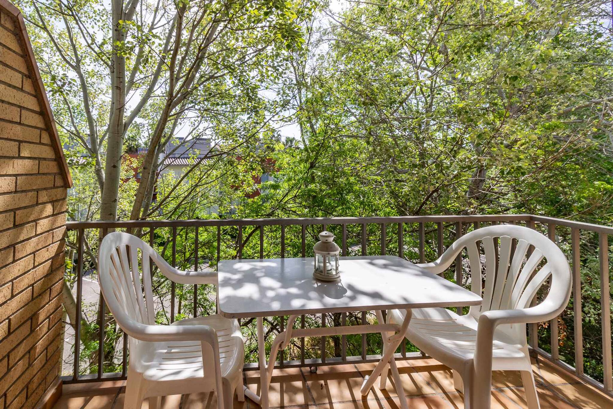 Extérieur: petite terrasse avec table et chaises.
