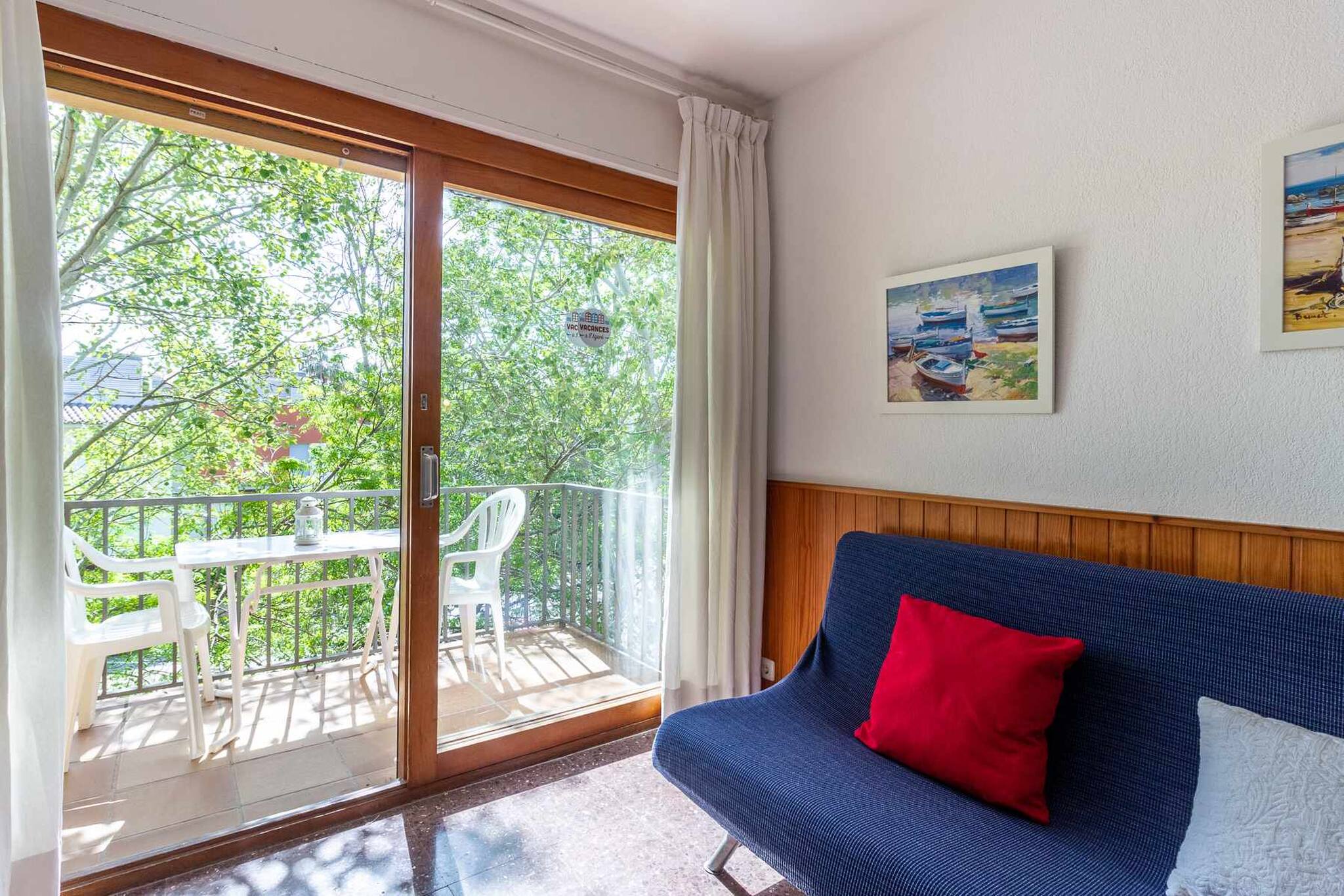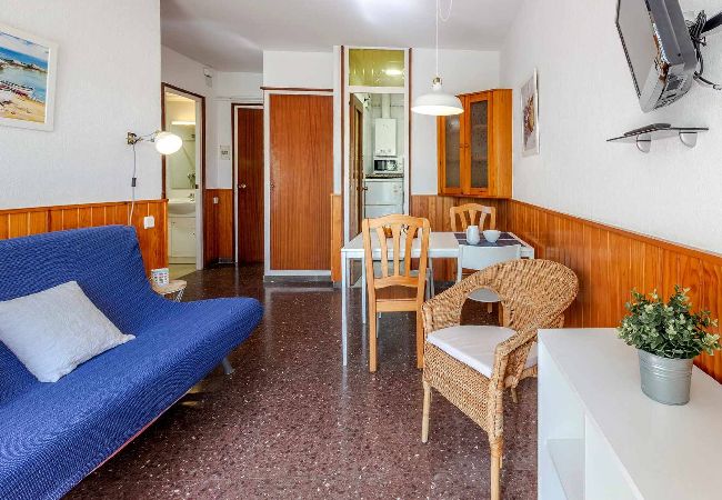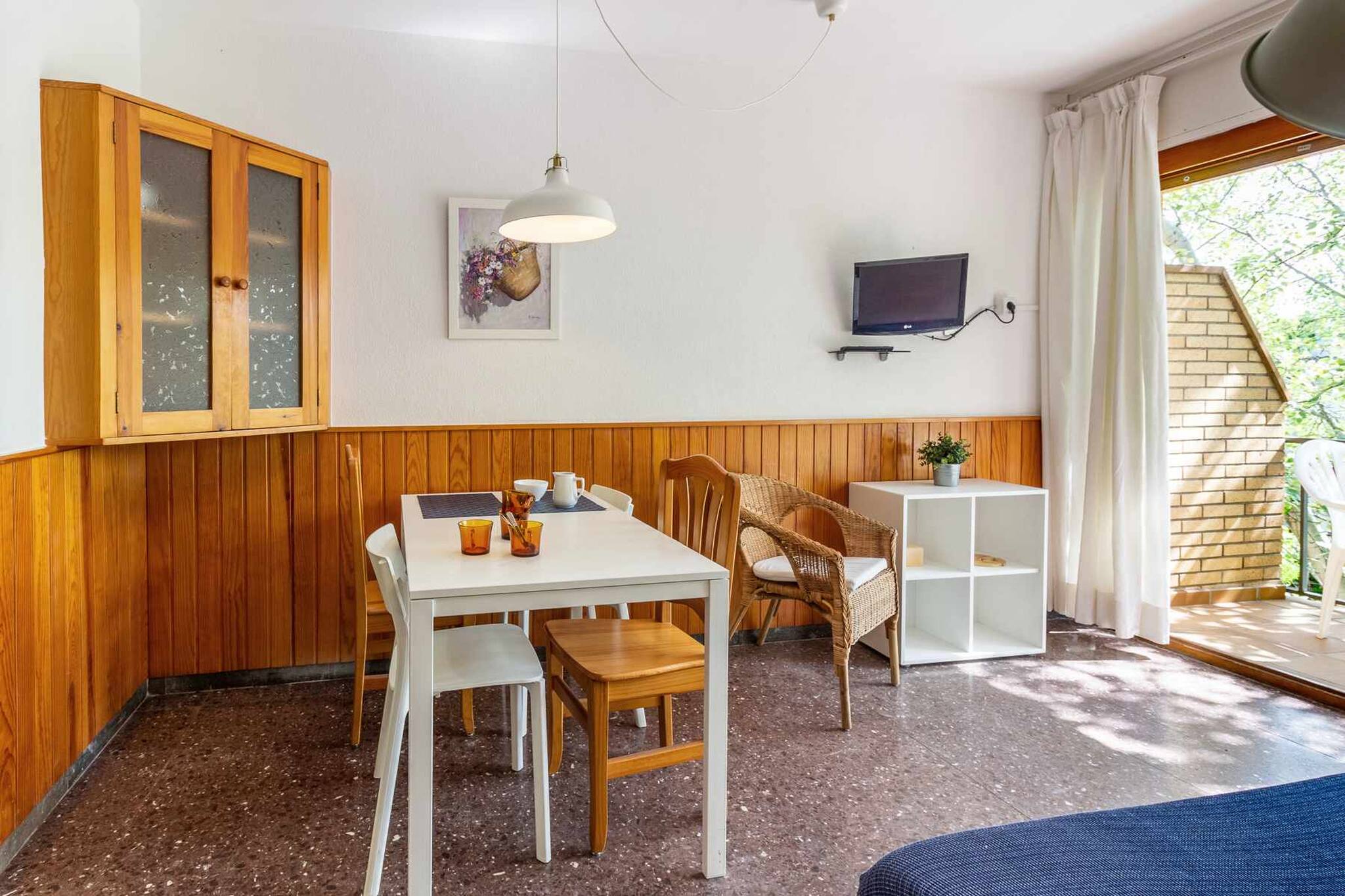 Séjour/salle à manger avec canapé-lit 2 places, TV, table et chaises.