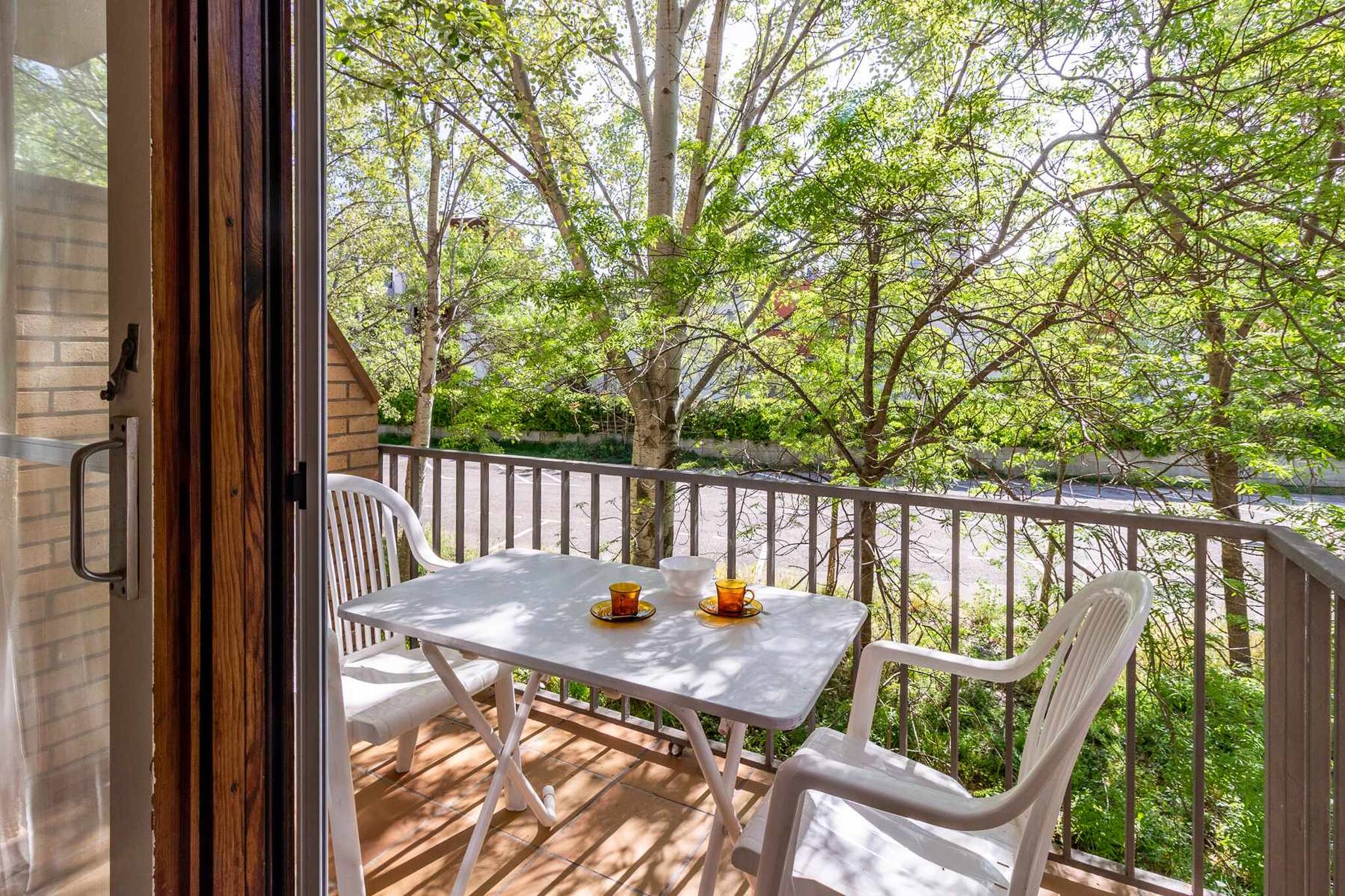 Extérieur: petite terrasse avec table et chaises.