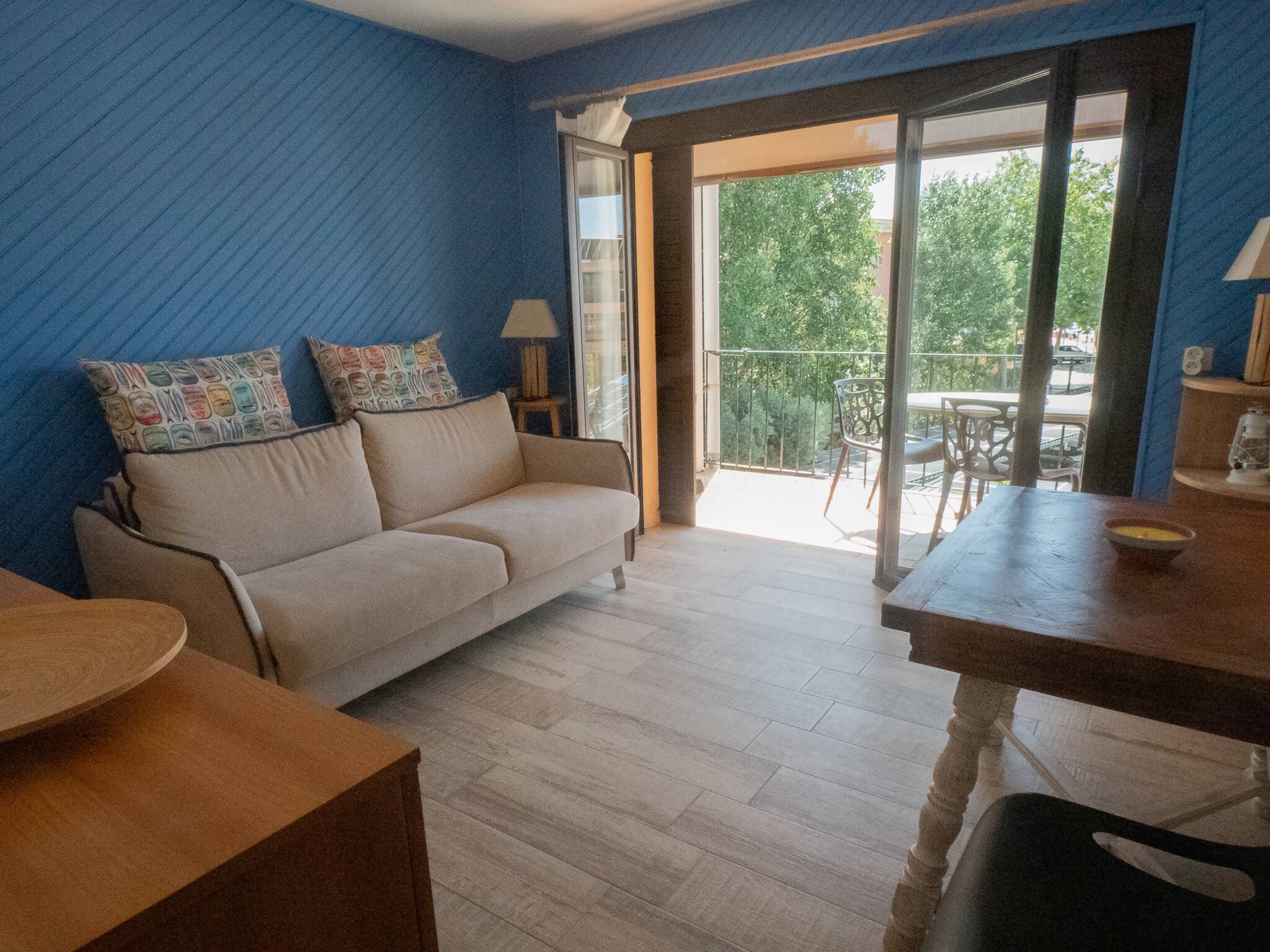 Séjour/salle à manger avec canapé-lit 2 places, TV, table et chaises.