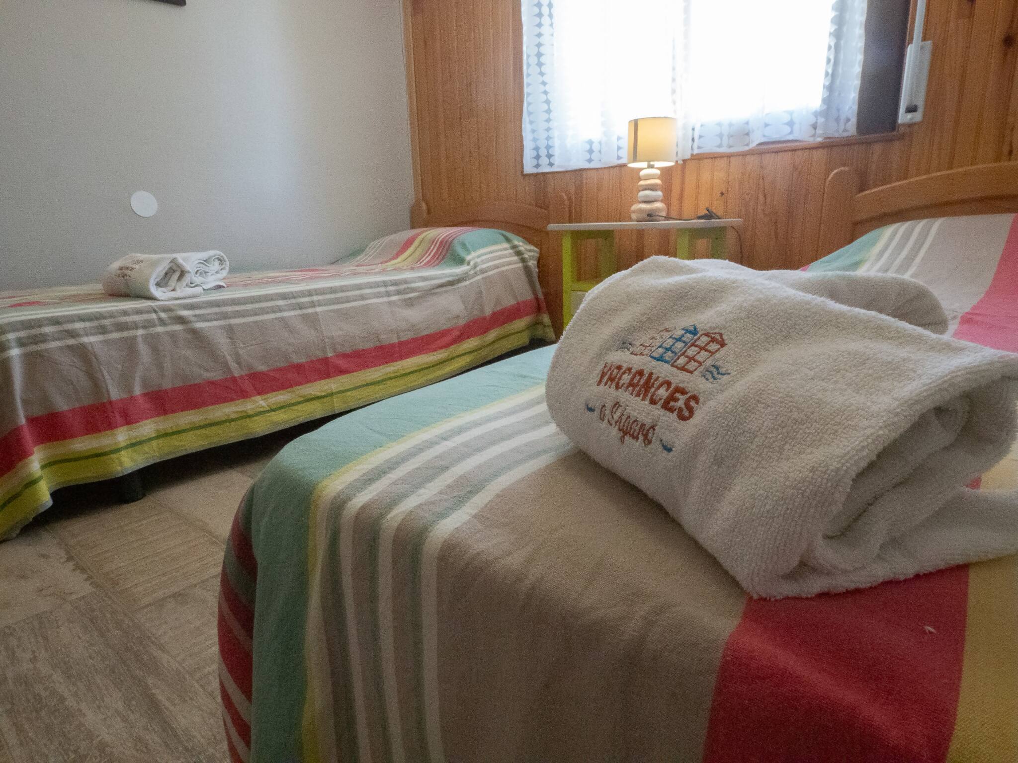 Chambres : une chambre avec un lit double avec TV et accès à la terrasse, une chambre avec deux lits simples. Tables, armoire, tiroirs, liseuse et cintres. Canapé-lit dans la salle à manger. Linge de lit.
