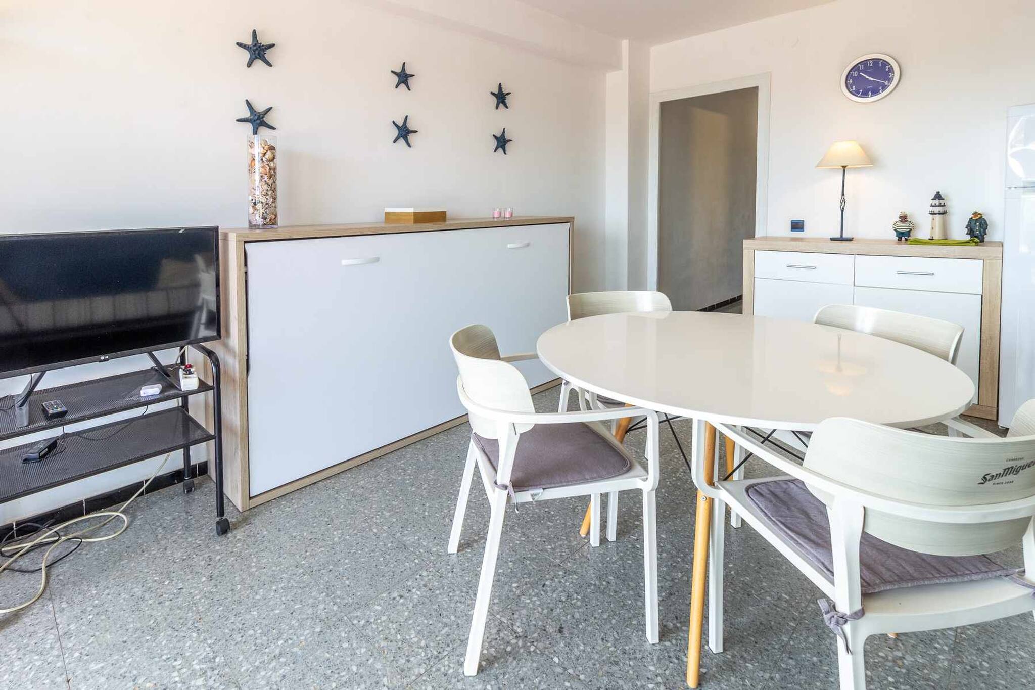 Séjour/salle à manger avec canapé-lit 2 places, TV, table et chaises.