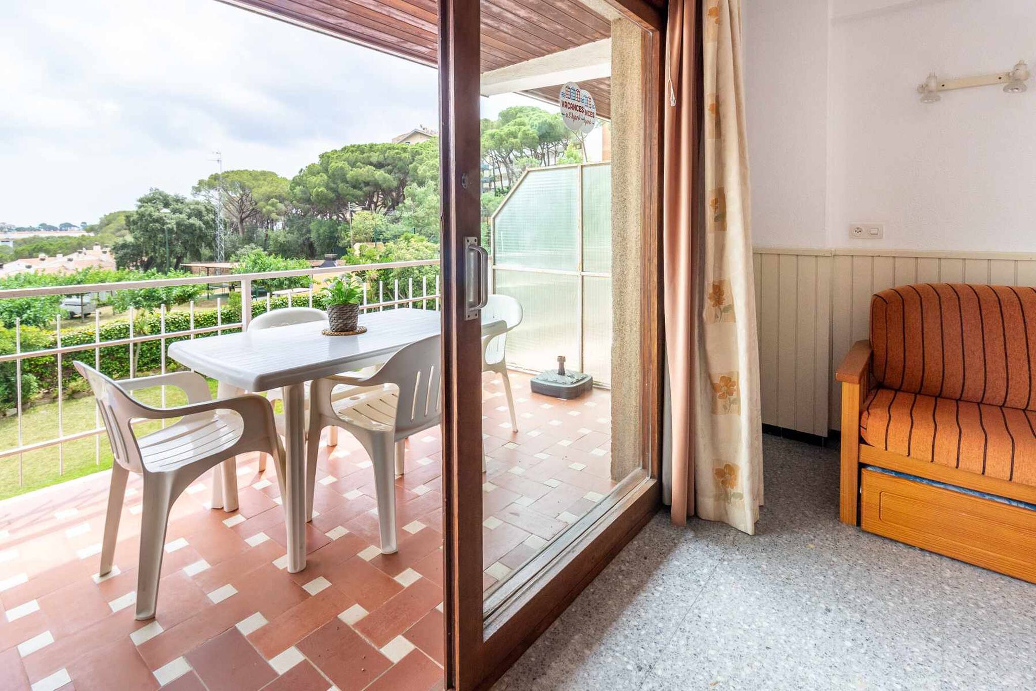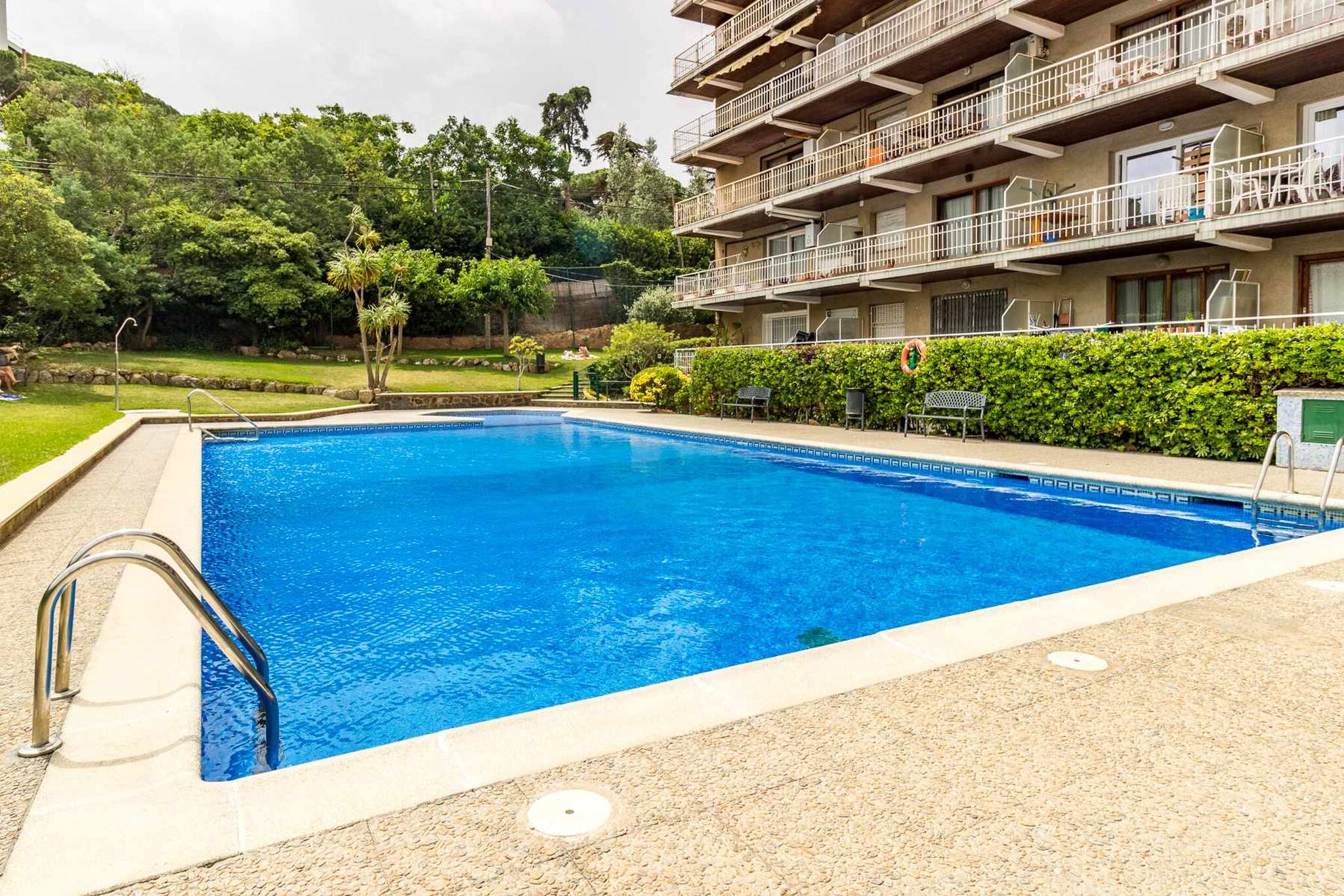 Appartement situé au troisième étage avec ascenseur et vue sur le jardin et la piscine communautaire.