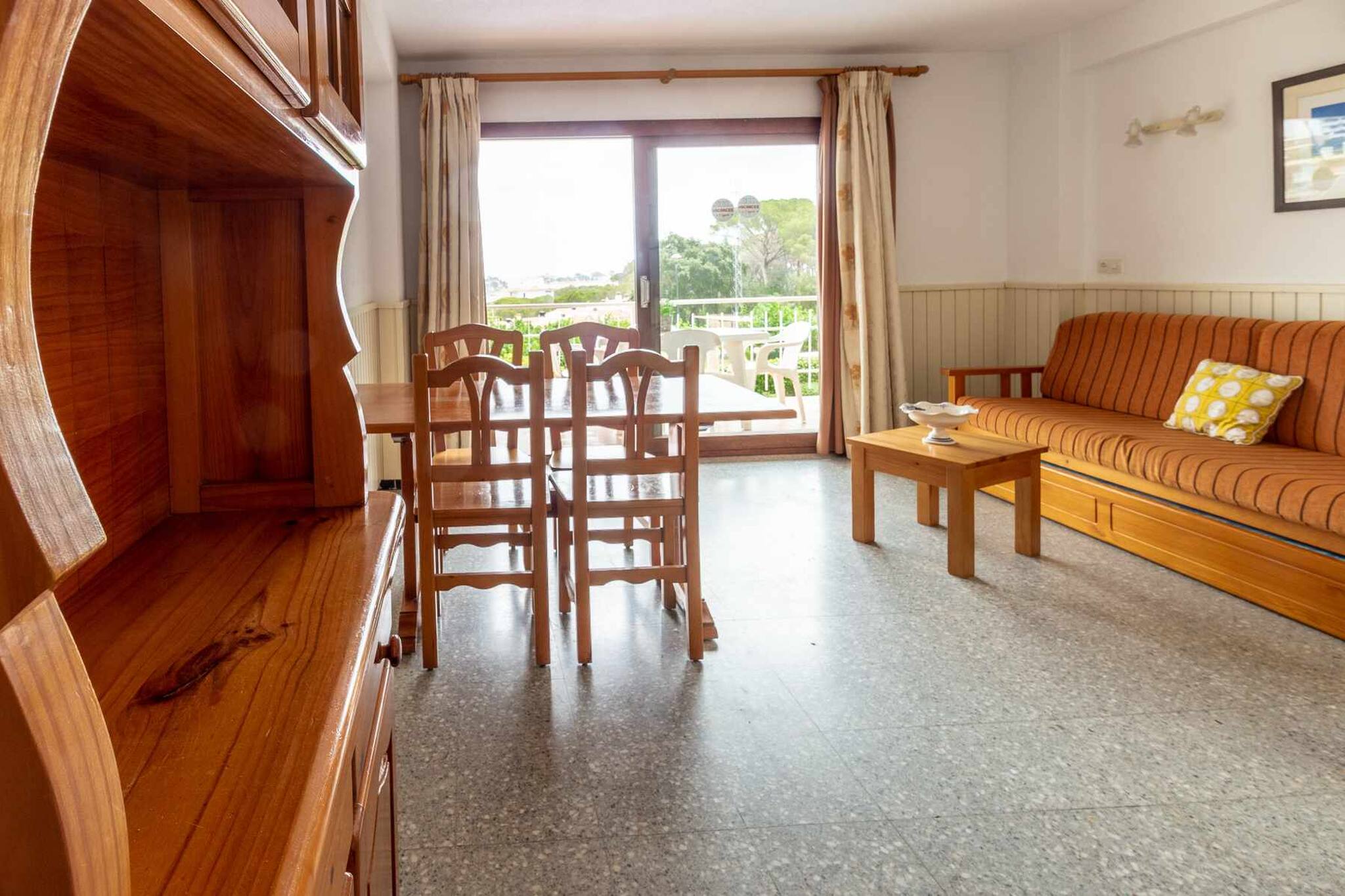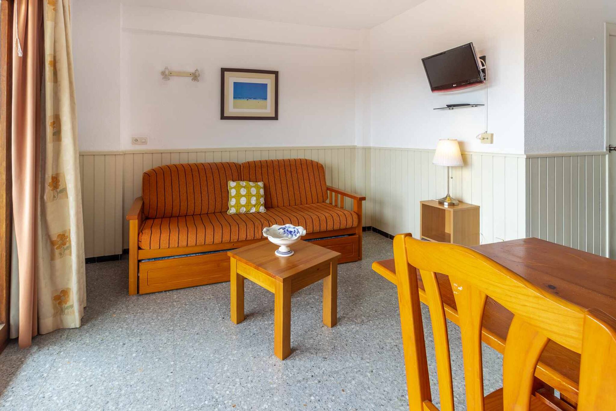 Séjour/salle à manger avec canapé-lit 2 places, TV, table et chaises.