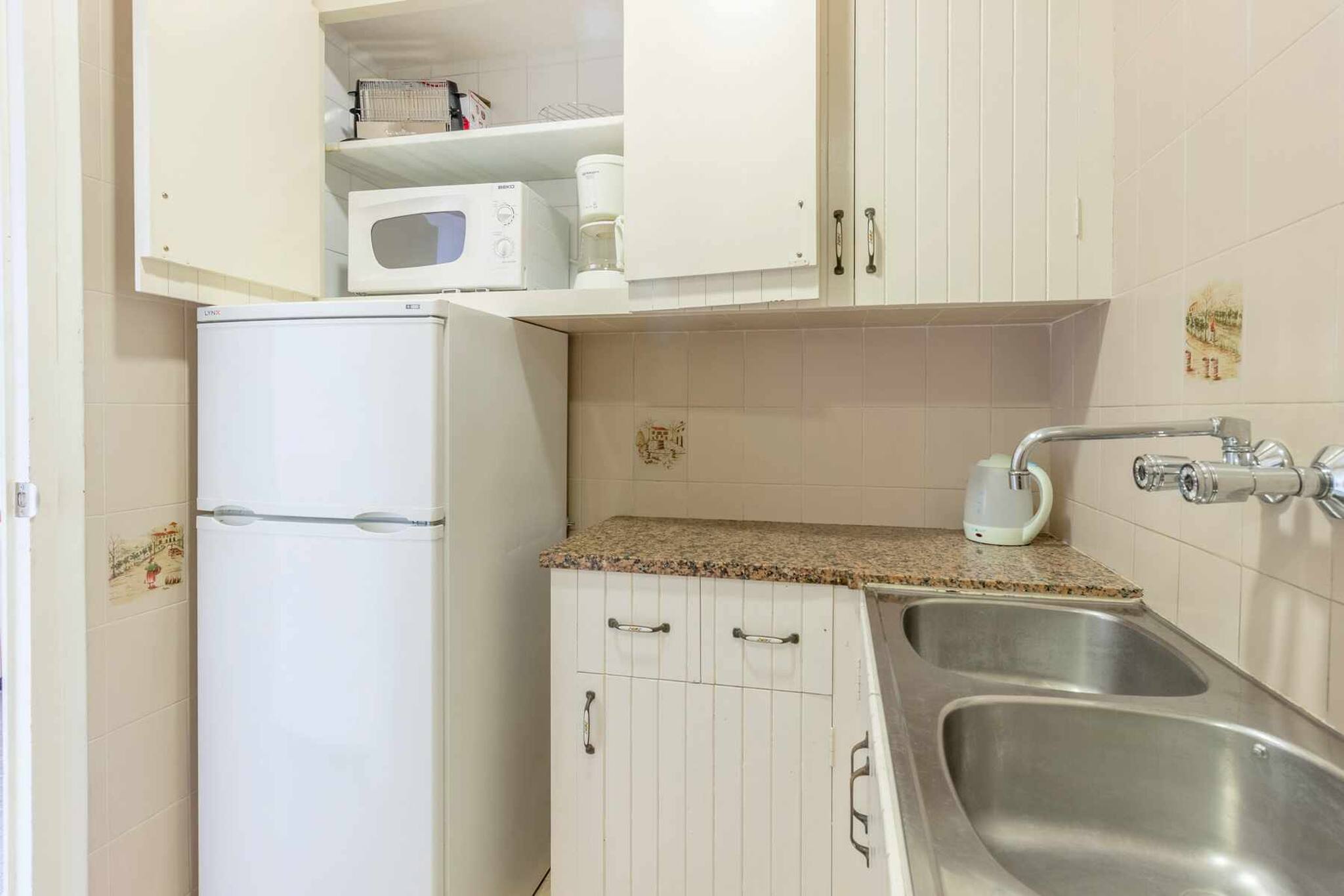 Cuisine équipée de plaque de cuisson vitrocéramique, réfrigérateur/congélateur, four, micro-ondes, cafetière melitta électrique, bouilloire, grille-pain et vaisselle.
