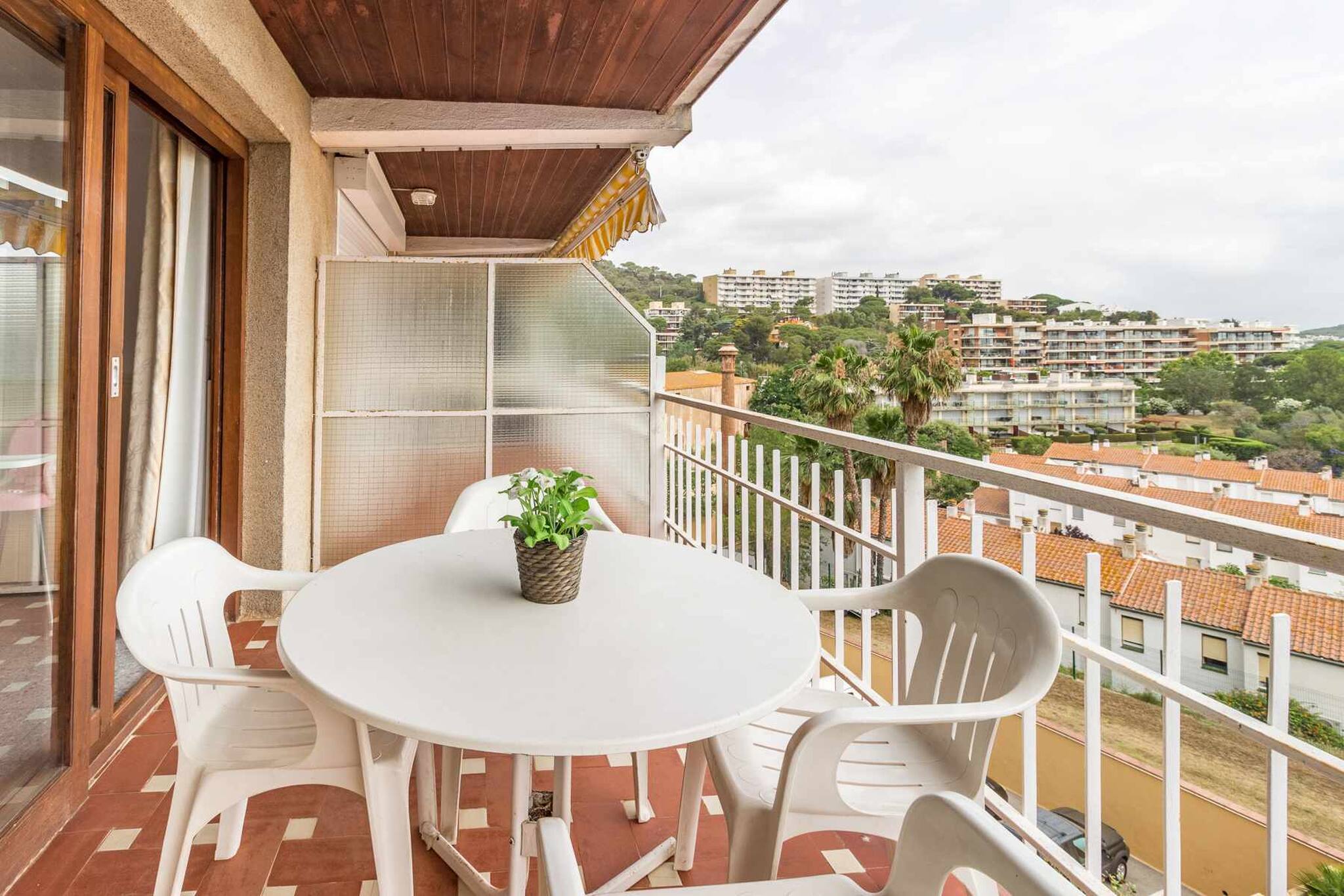 Extérieur: petite terrasse avec table et chaises.