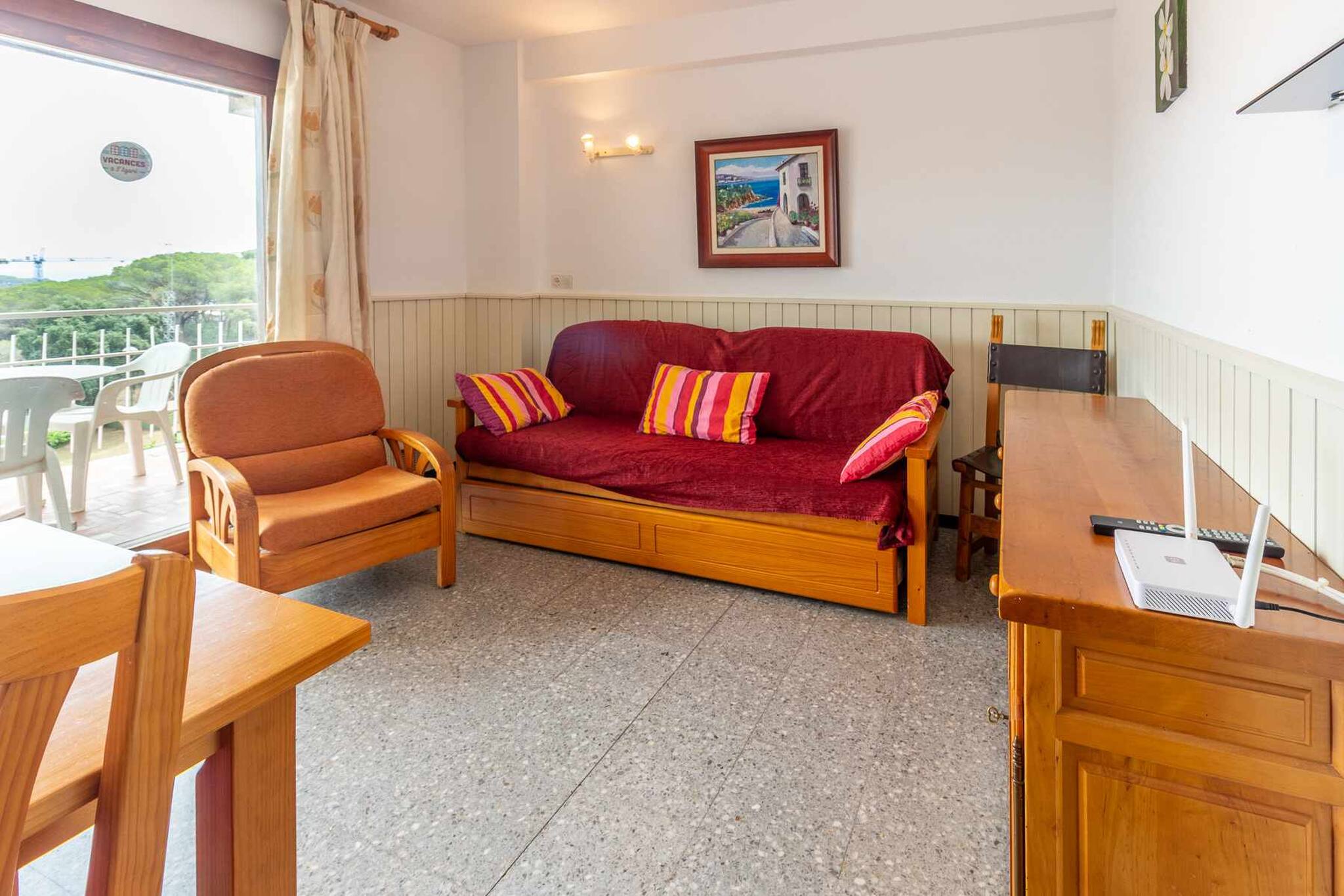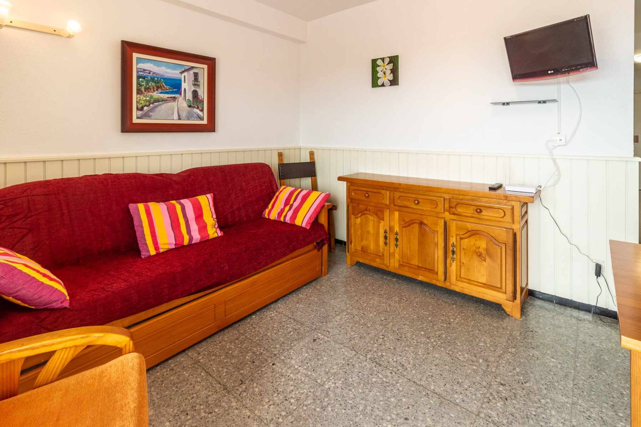 Salle à manger: salle de séjour avec canapé-lit, TV et table à manger avec chaises en bois.