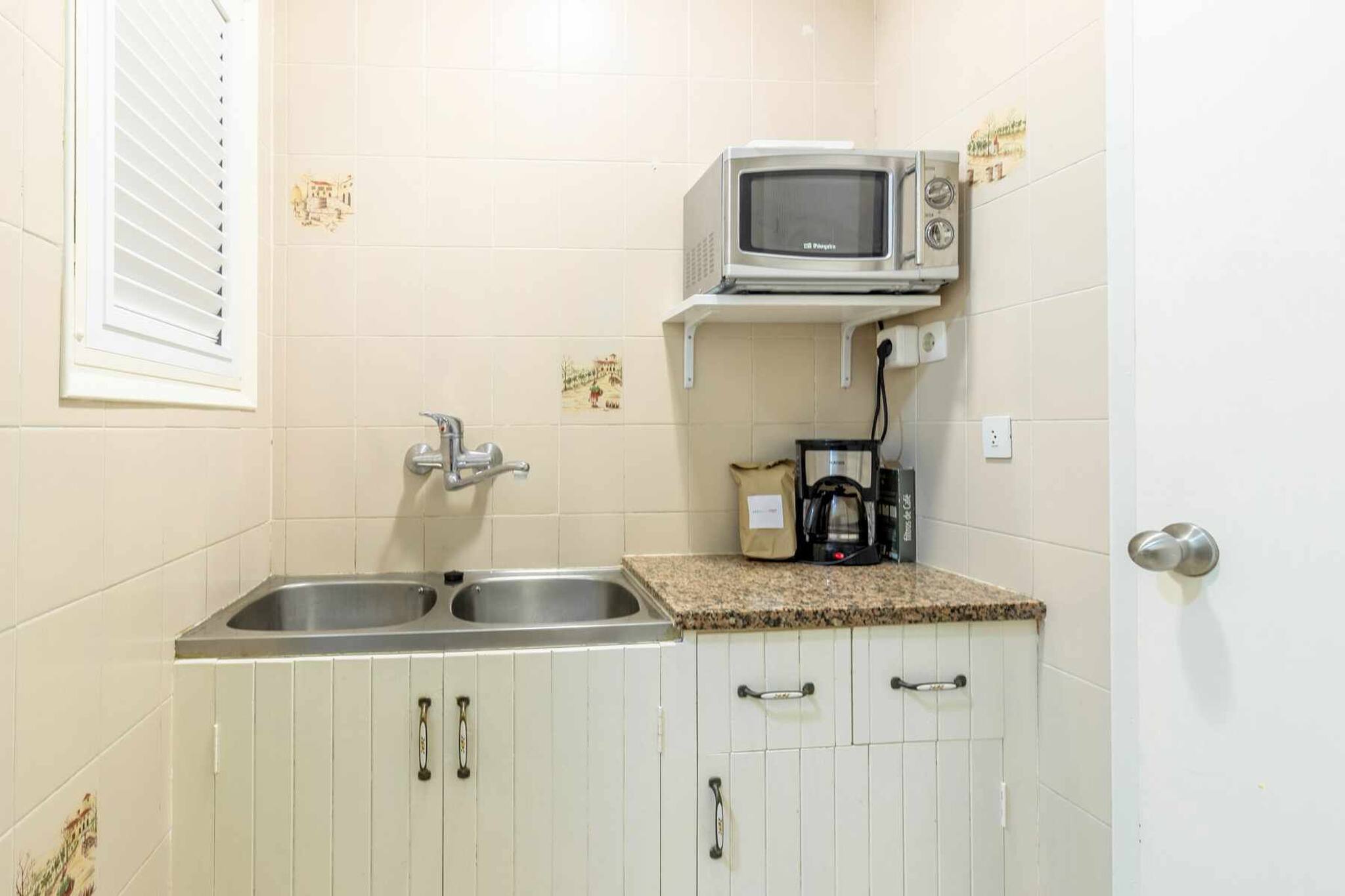 Cuisine équipée de plaque de cuisson, réfrigérateur/congélateur, four, micro-ondes, cafetière melitta électrique, bouilloire, grille-pain et vaisselle.