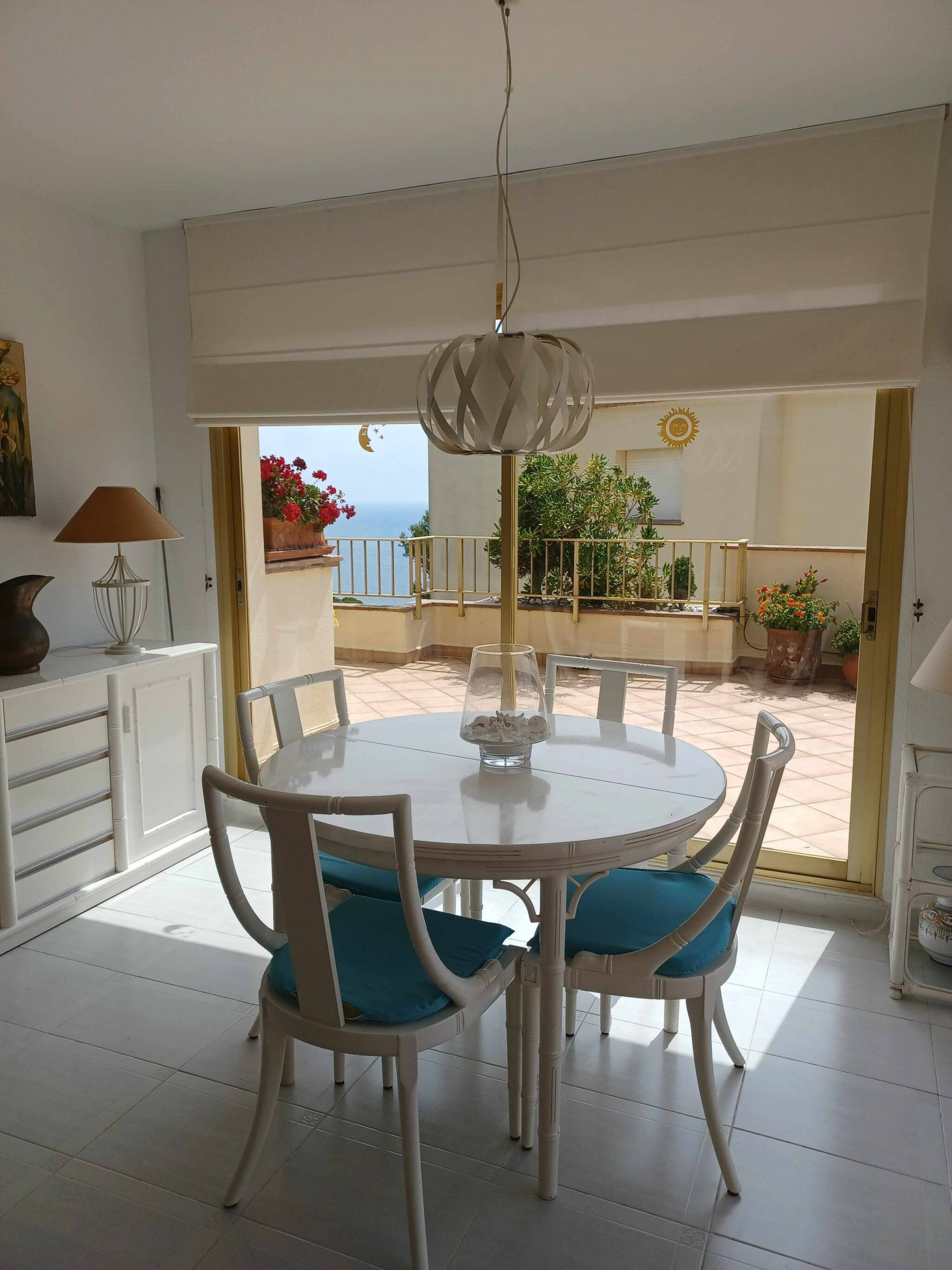 La grande terrasse extérieure. Il dispose d'un mobilier extérieur et offre des vues spectaculaires sur la mer. Wifi et chauffage central. Il y a un jardin avec piscine communautaire et place de parking privée nº 15.