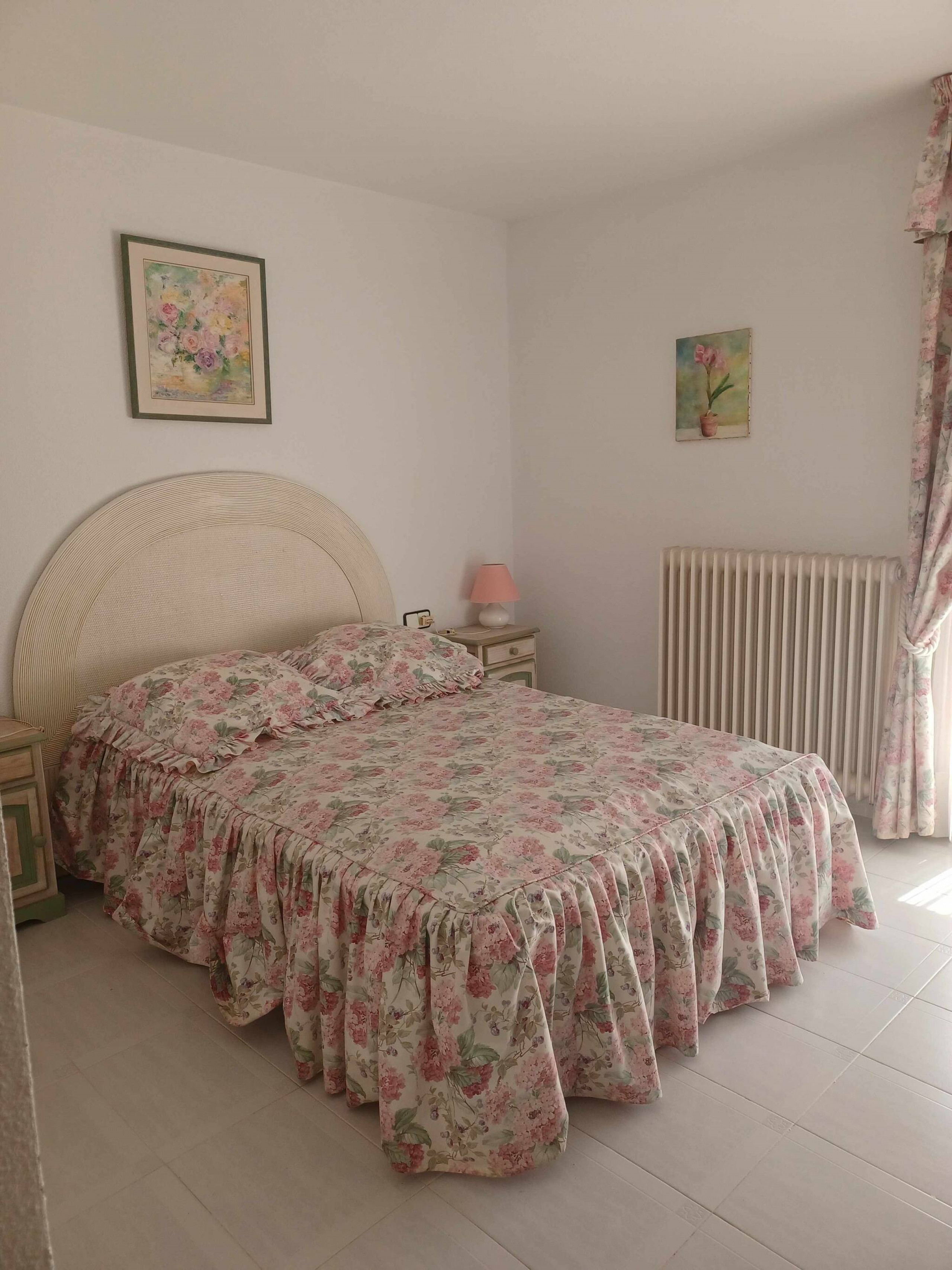 Chambres : une chambre avec un lit double, une chambre avec deux lits simples. Tables, armoire, tiroirs, liseuse et cintres. Canapé-lit dans la salle à manger. Linge de lit.