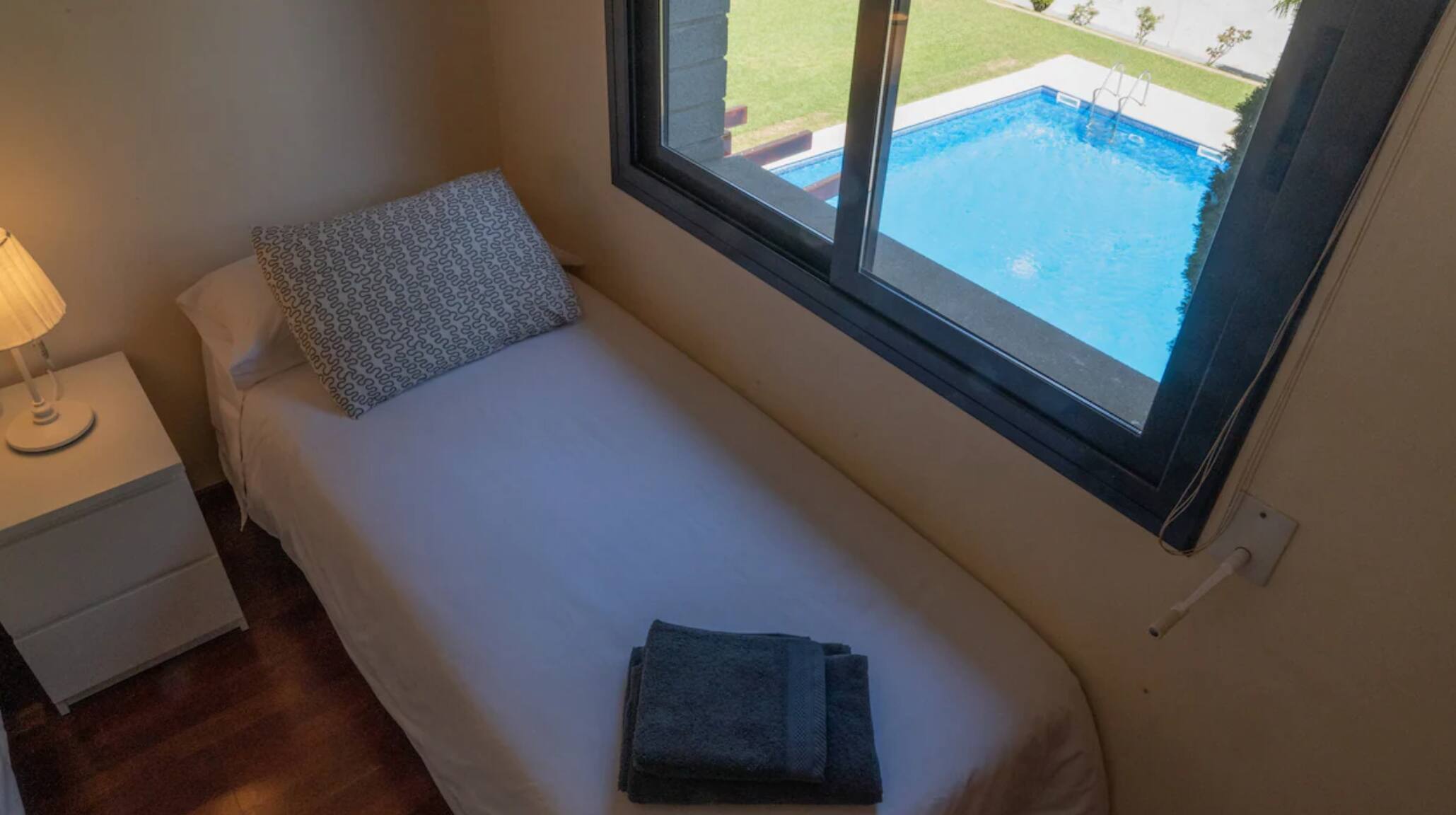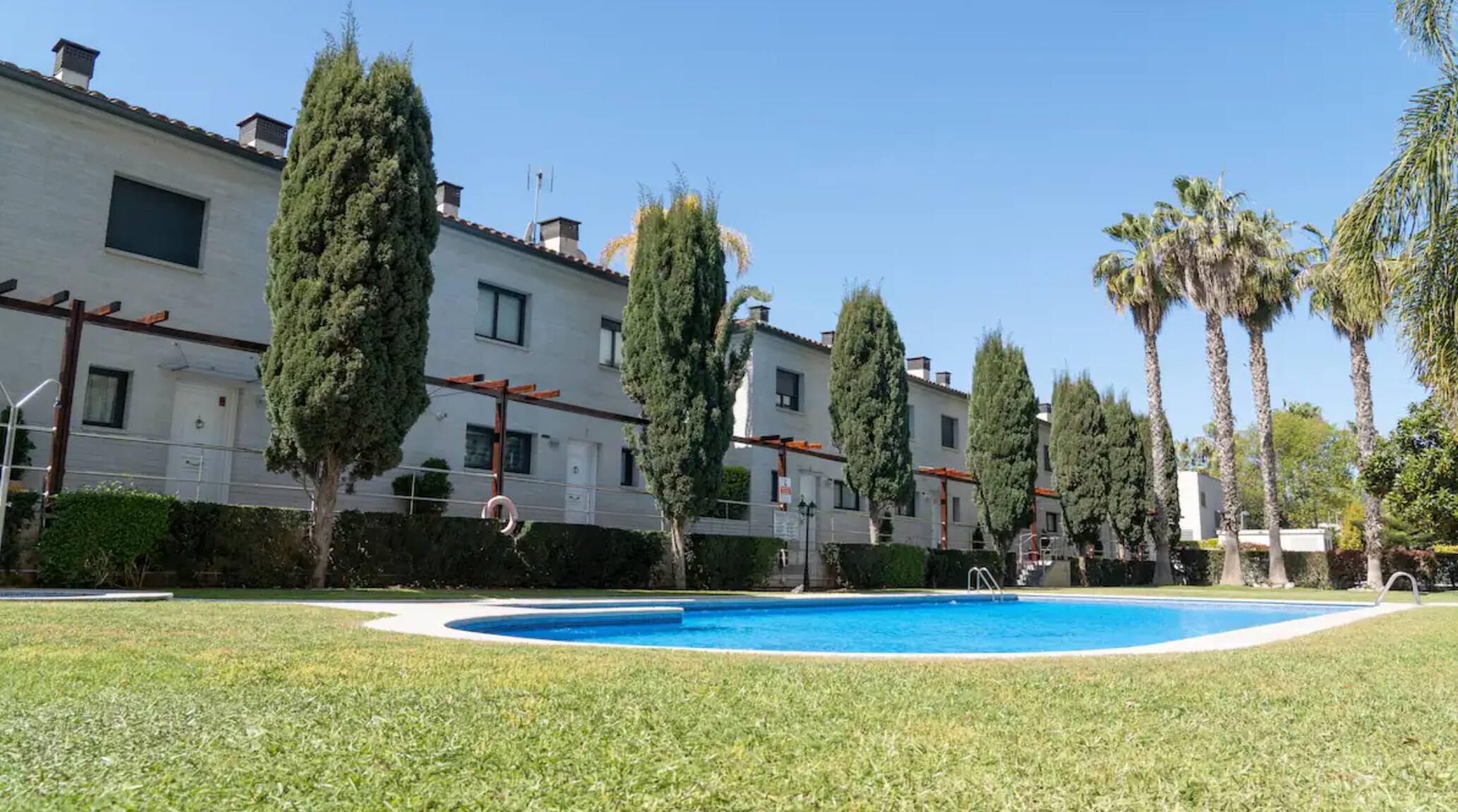 La maison est située dans un complexe résidentiel entièrement fermé et dispose d'une piscine commune et de grands jardins. L'ensemble de cet espace dispose d'un accès privé fermé à clé, à l'usage exclusif des résidents. C'est une petite communauté très calme avec peu de voisins, et la piscine est très proche de notre maison.