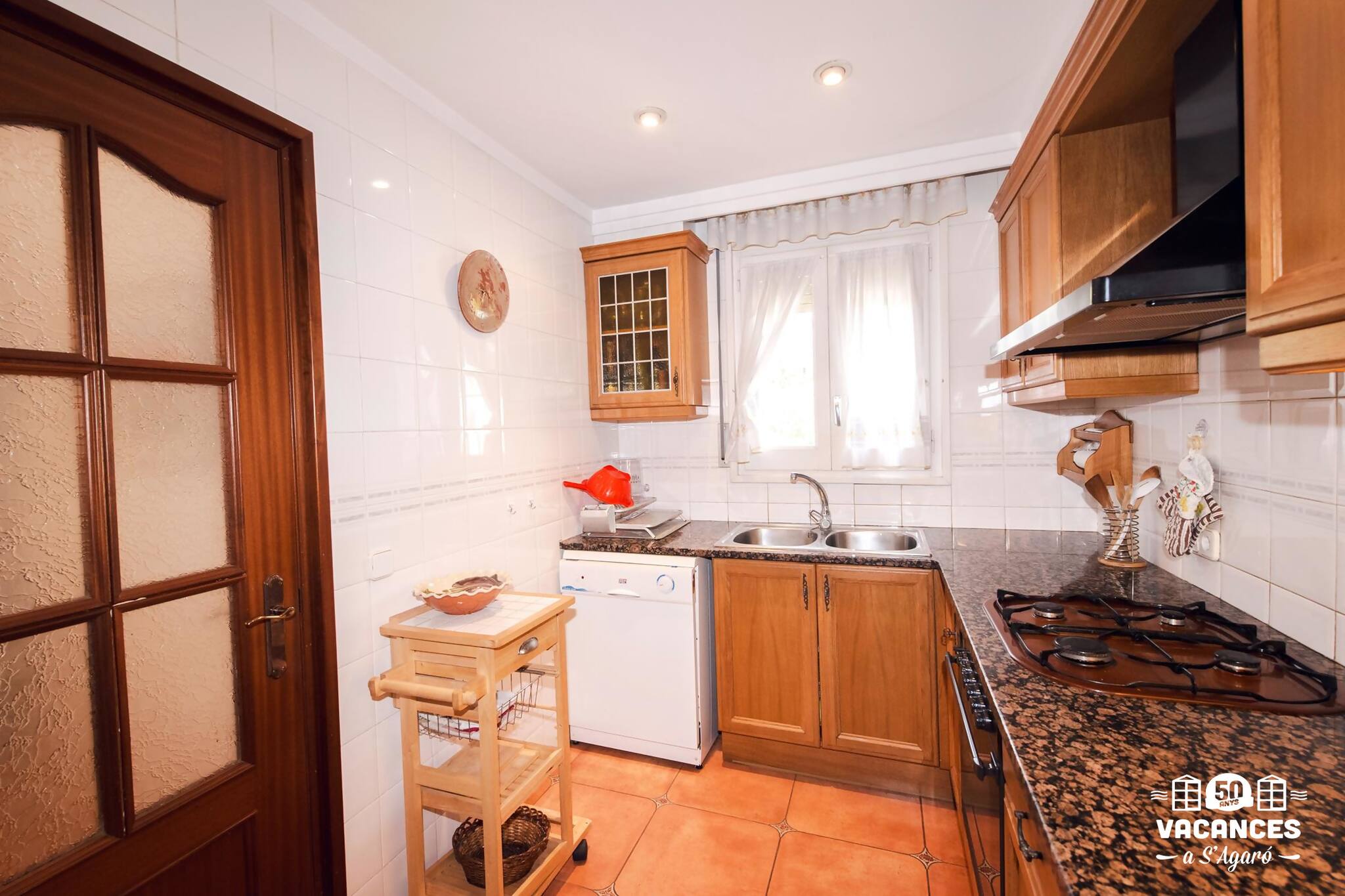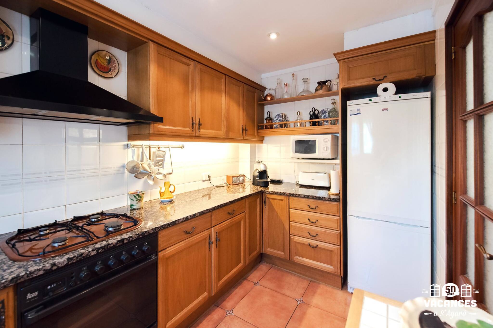 Cuina equipada amb encimera, rentavaixelles, nevera, congelador, microones, cafetera, vaixella, forn.