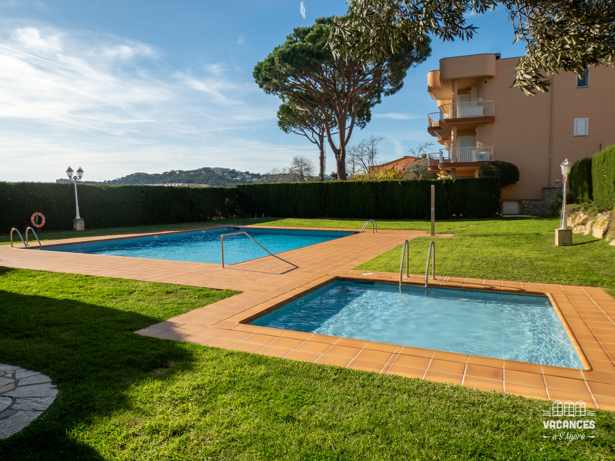 Apartament ideal per a les teves vacances a S'Agaró, amb vistes espectaculars i prop de la platja, amb piscina i piscina infantil, àmplia terrassa. Amb plaça de pàrquing assignada. A la part alta de S'Agaró i amb un bonic passeig de 14 minuts a la platja. Wifi