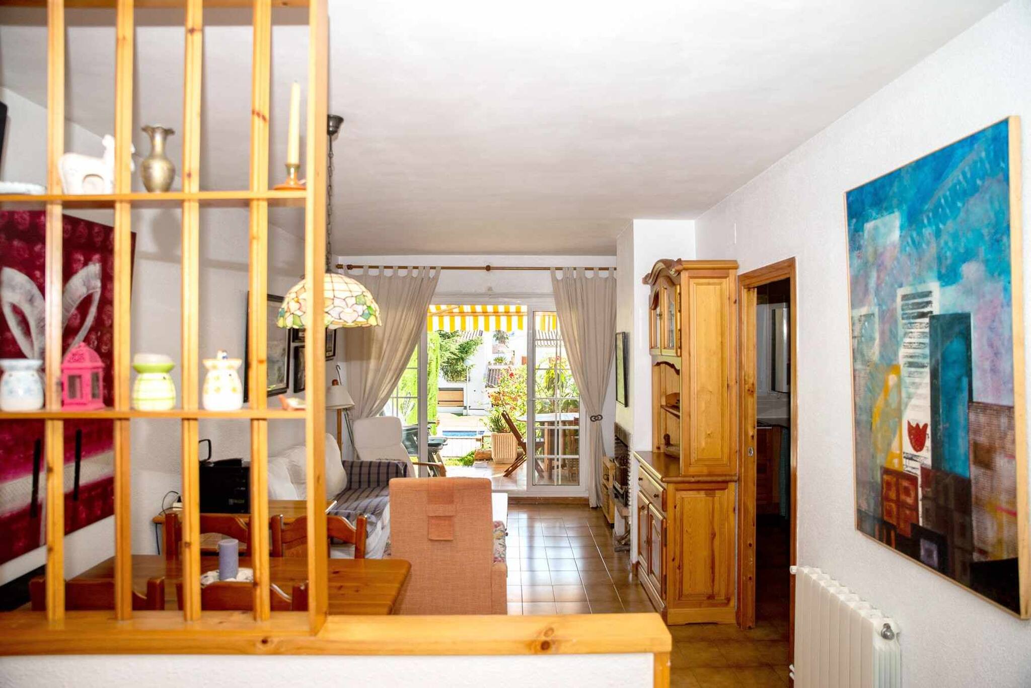 Sala d'estar - menjador: Sofà, TV, taula i cadires de menjador, sortida a la terrassa.