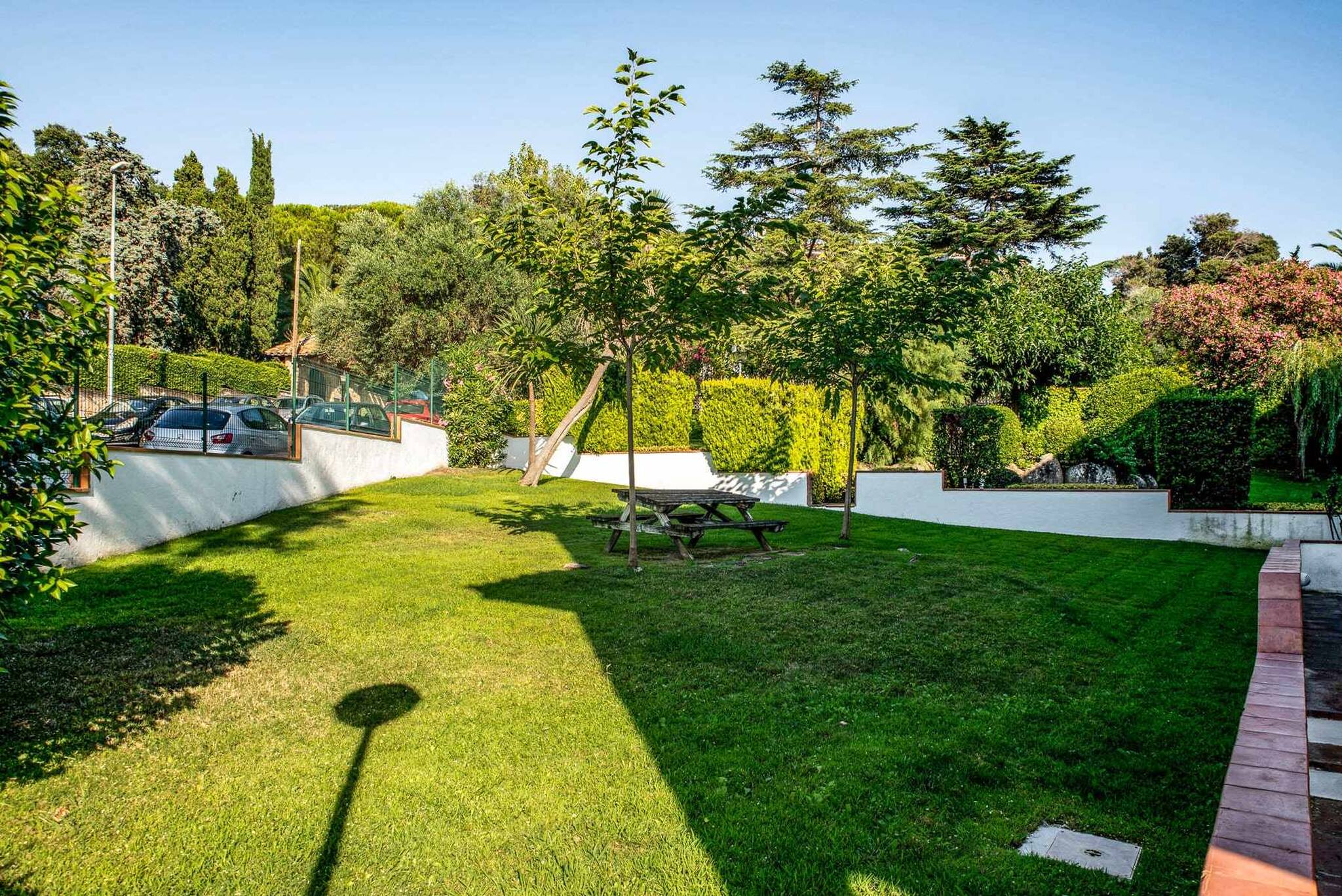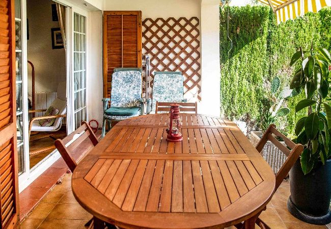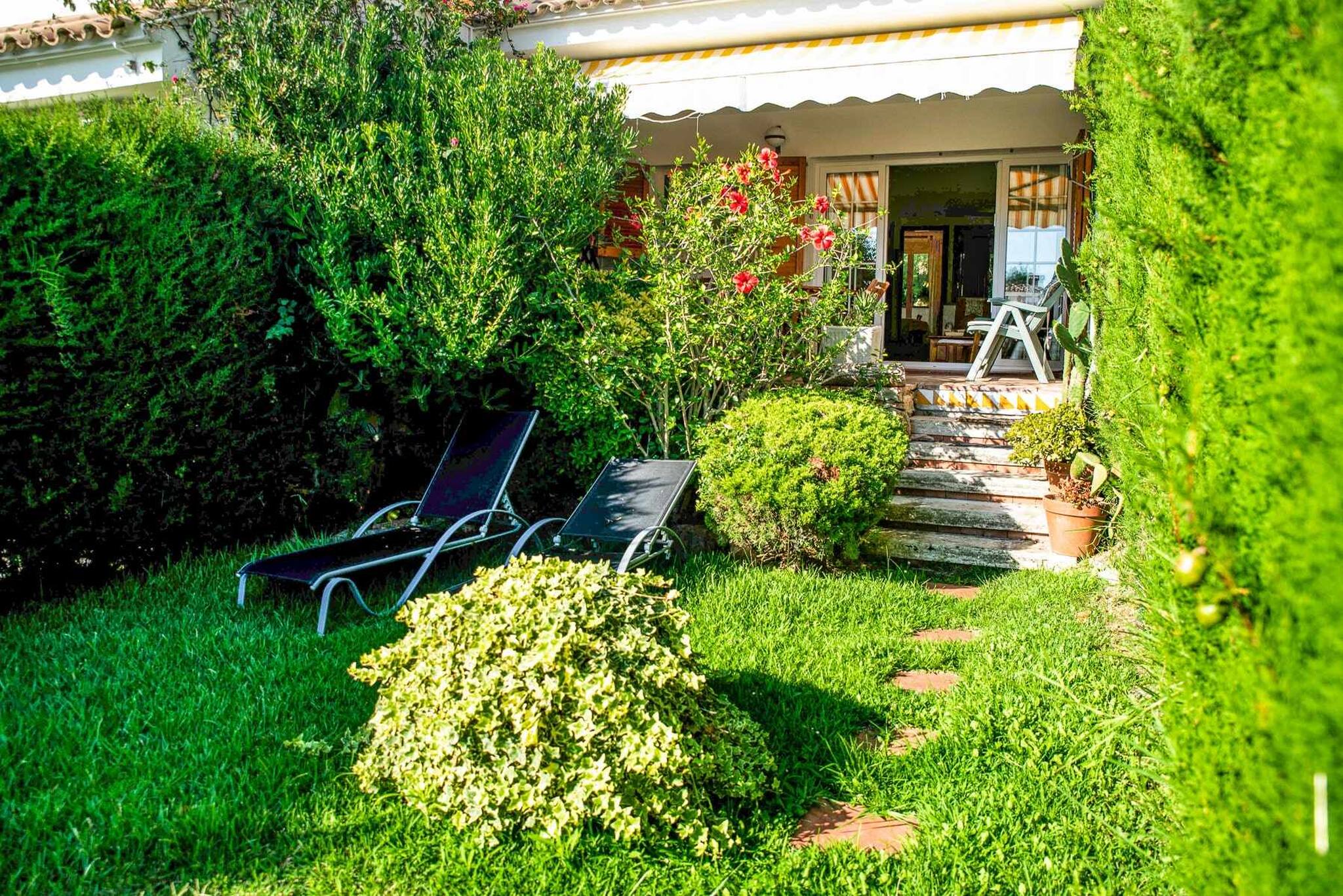 Zona exterior amb porxe amb tendal i mobiliari d'exterior. Jardí amb gandules i barbacoa. Des del jardí privat accedim a la piscina comunitària, pista de tenis i zona de pícnic.