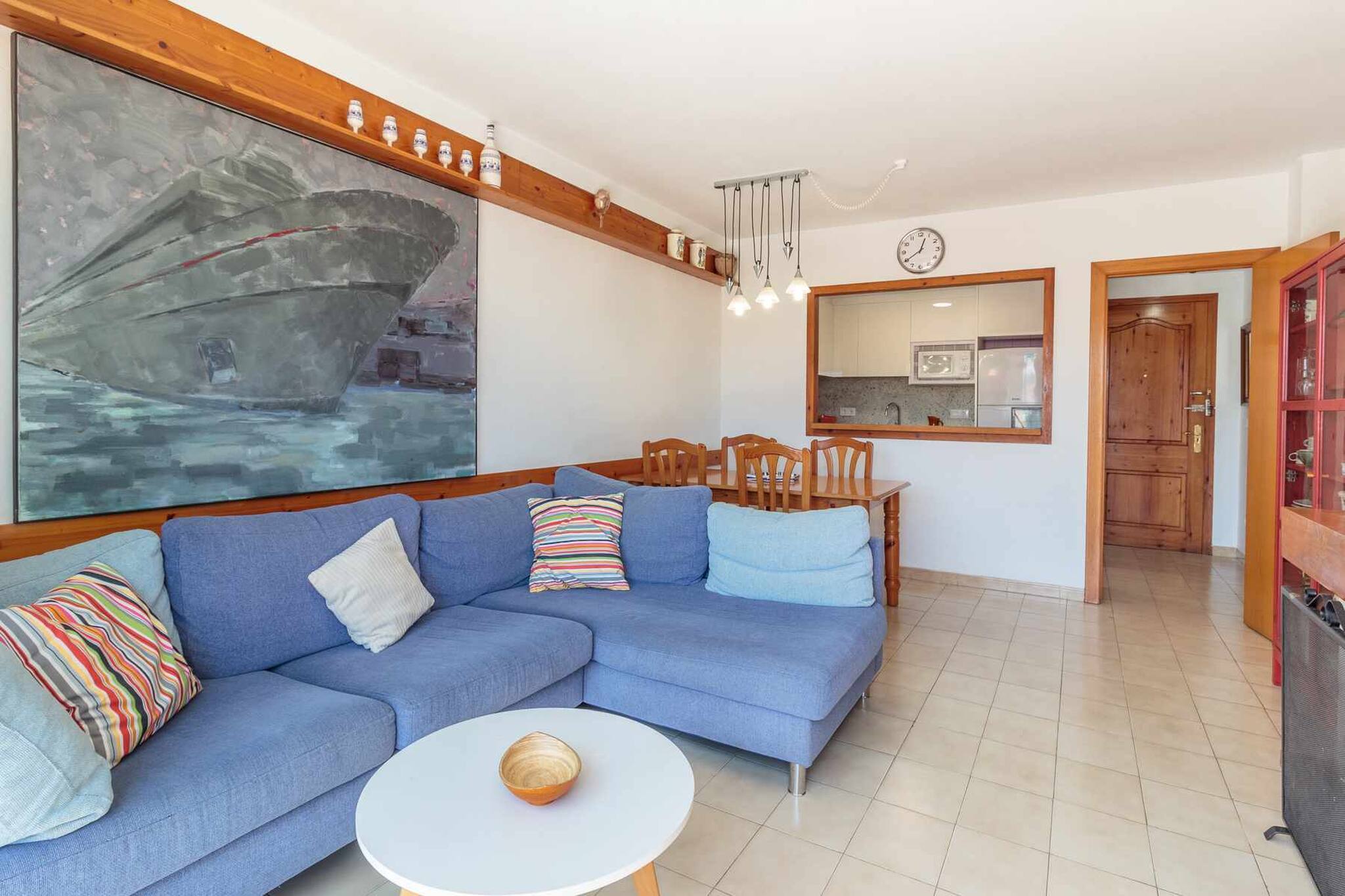 Menjador: taula i cadires, sala d'estar amb sofà llit, butaca, TV.