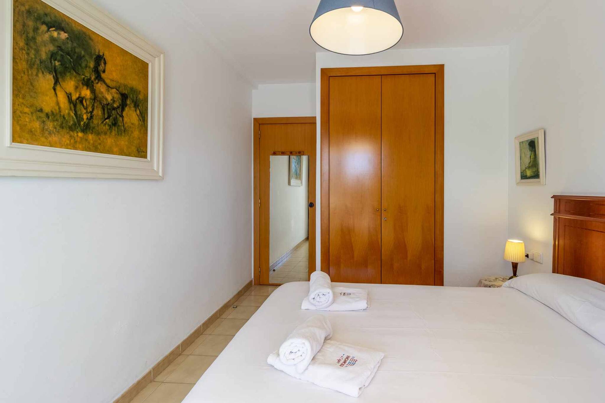 Habitacions: una habitació doble amb dos llits individual, armaris, tauletes, calaixera. Sofà llit al menjador. Roba de llit.