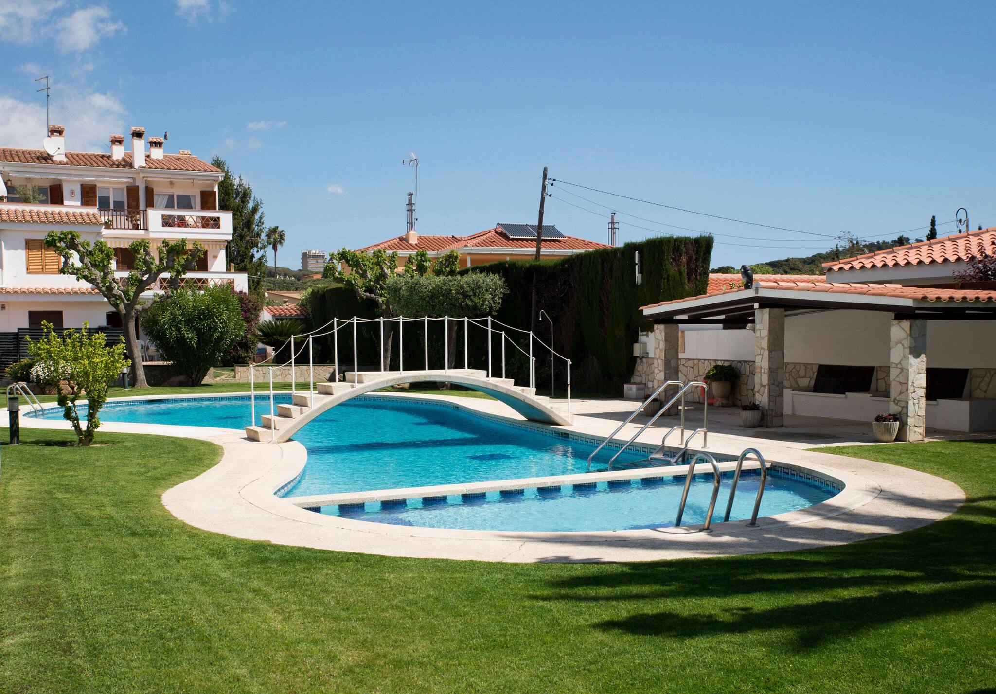Zona exterior amb porxe amb tendal i mobiliari d'exterior. Jardí amb gandules i barbacoa. Des del jardí privat accedim a la piscina comunitària, pista de tenis i zona de pícnic.