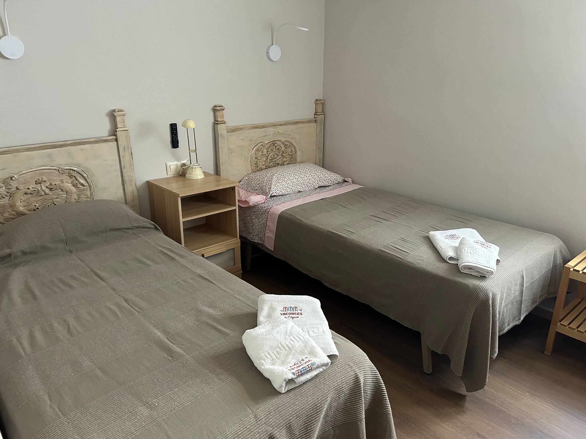 Habitacions: 2 habitacions una amb llit de matrimoni i l'altre amb dos llits individuals, tauletes, armaris. Roba de llit.