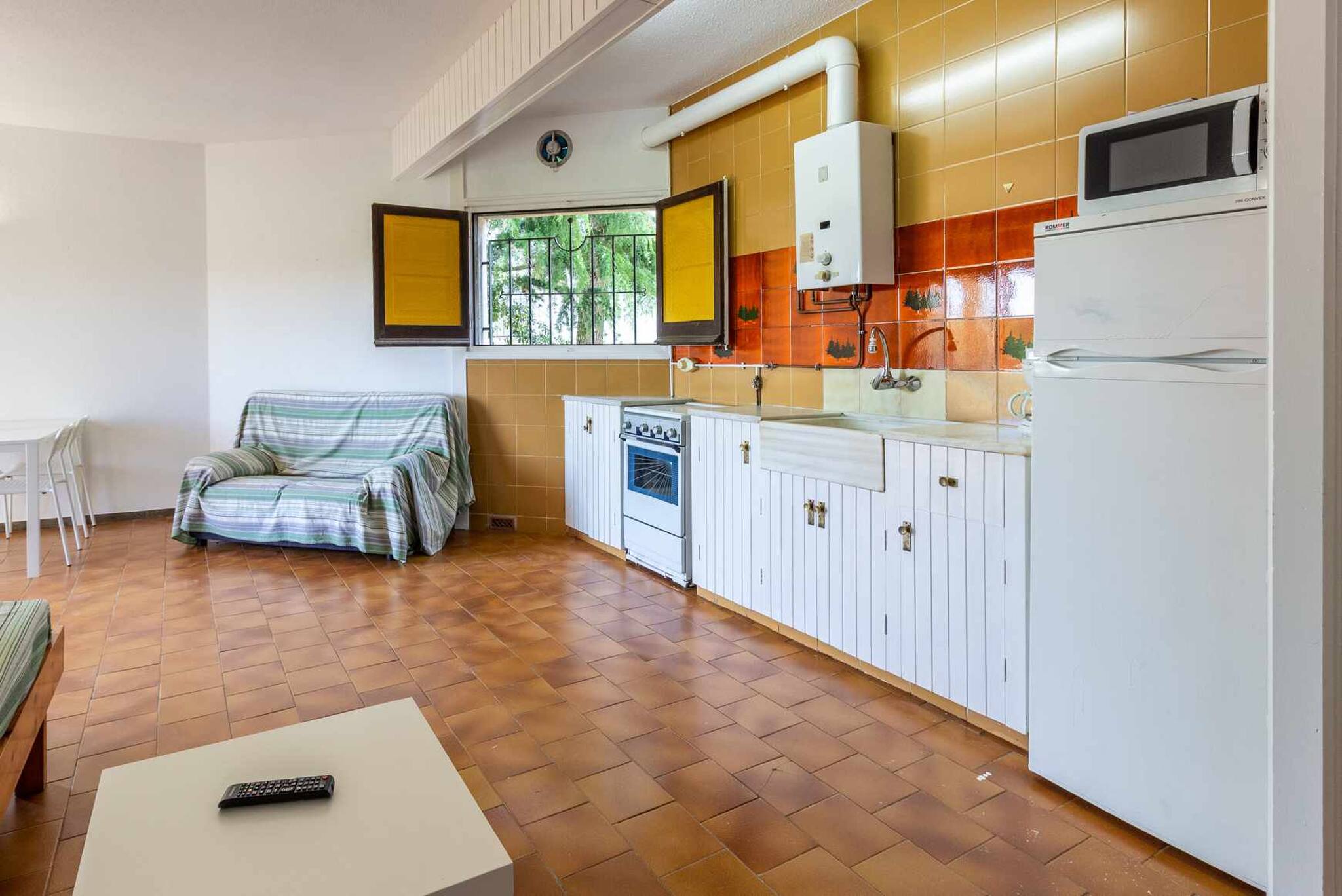 Menjador:-sala d'estar amb sofà, sofà llit, TV, taula de menjador amb cadires de fusta.