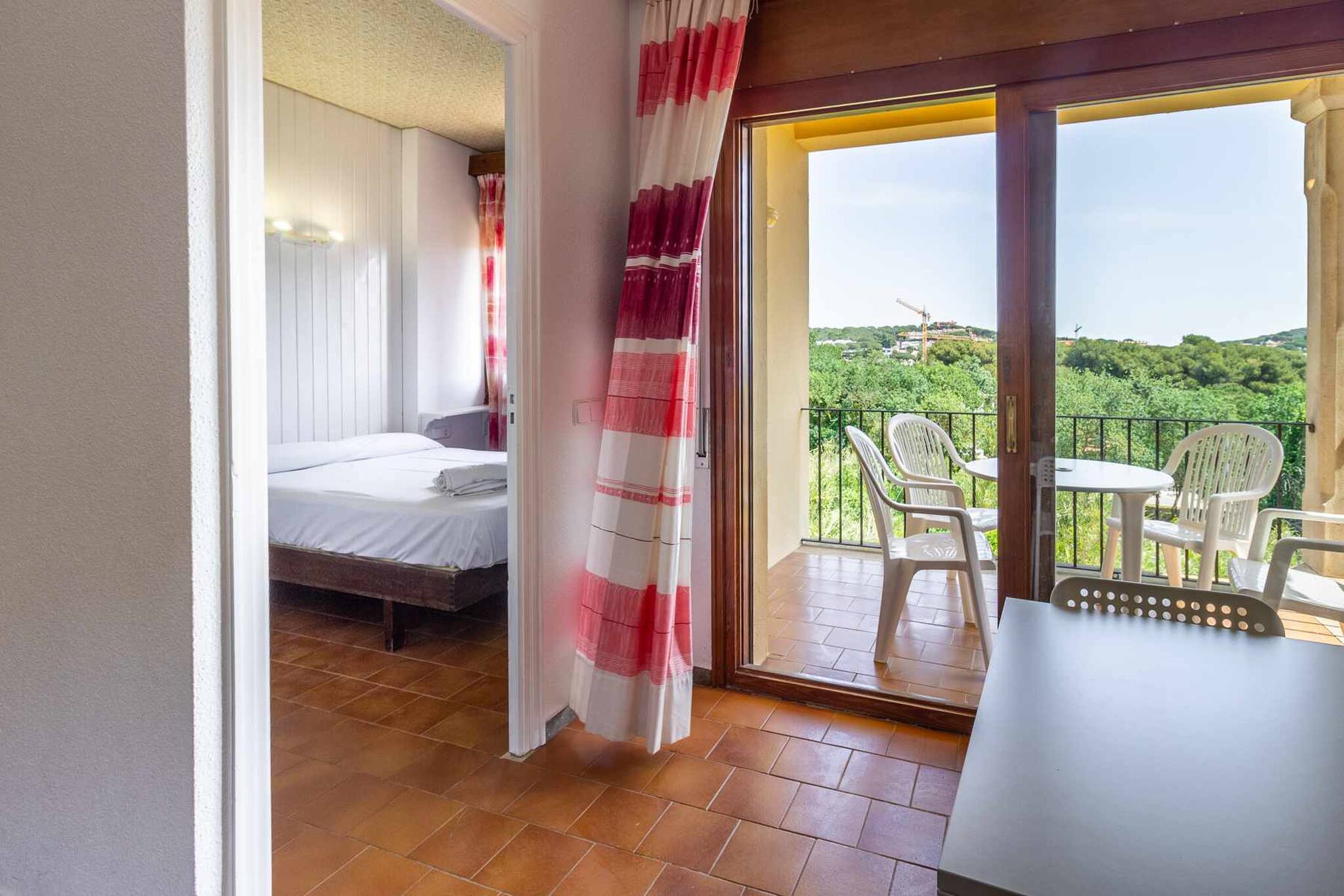 Disposa d'una habitació amb llit de matrimoni i una habitació amb llit individual. Bany complet amb banyera. Espai obert amb cuina americana i sala d'estar-menjador amb sofà, sofà llit, taula i cadires de fusta i sortida a la petita terrassa amb mobiliari d'exterior.